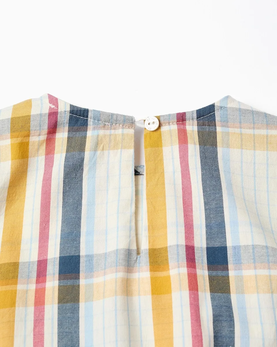Коллекция Brothers & Sisters. Блузка в клетку белых, желтых, синих и красных оттенков для девочек. 100% хлопок. Эластичные манжеты и подол с воланами. Застегивается на пуговицу сзади. Яркий и оригинальный узор для одинаковых нарядов для братьев и сестер!