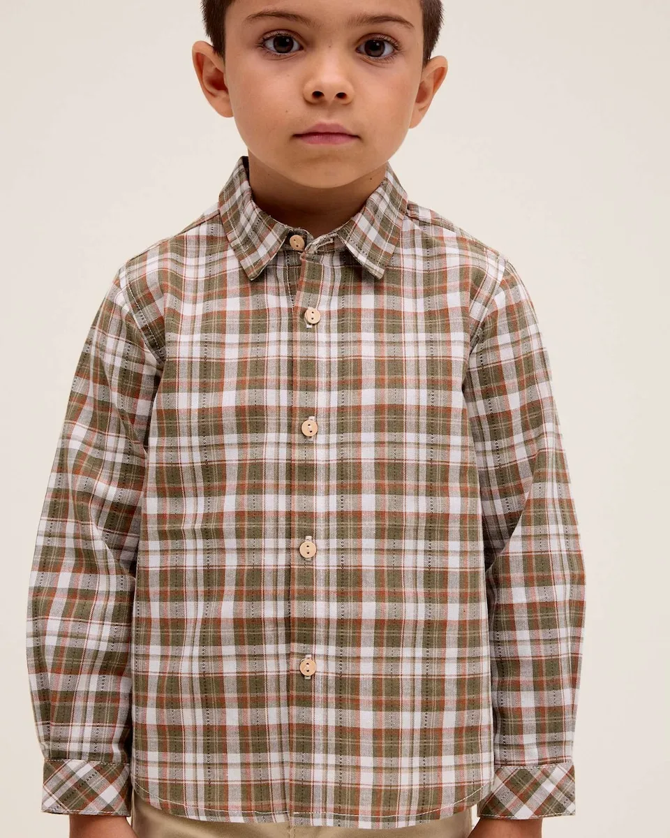 Рубашка для мальчика с длинным рукавом в клетку, с v-образным вырезом, деревянными пуговицами спереди, удобная, универсальная и стильная для любого случая.