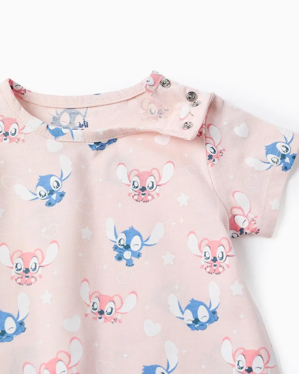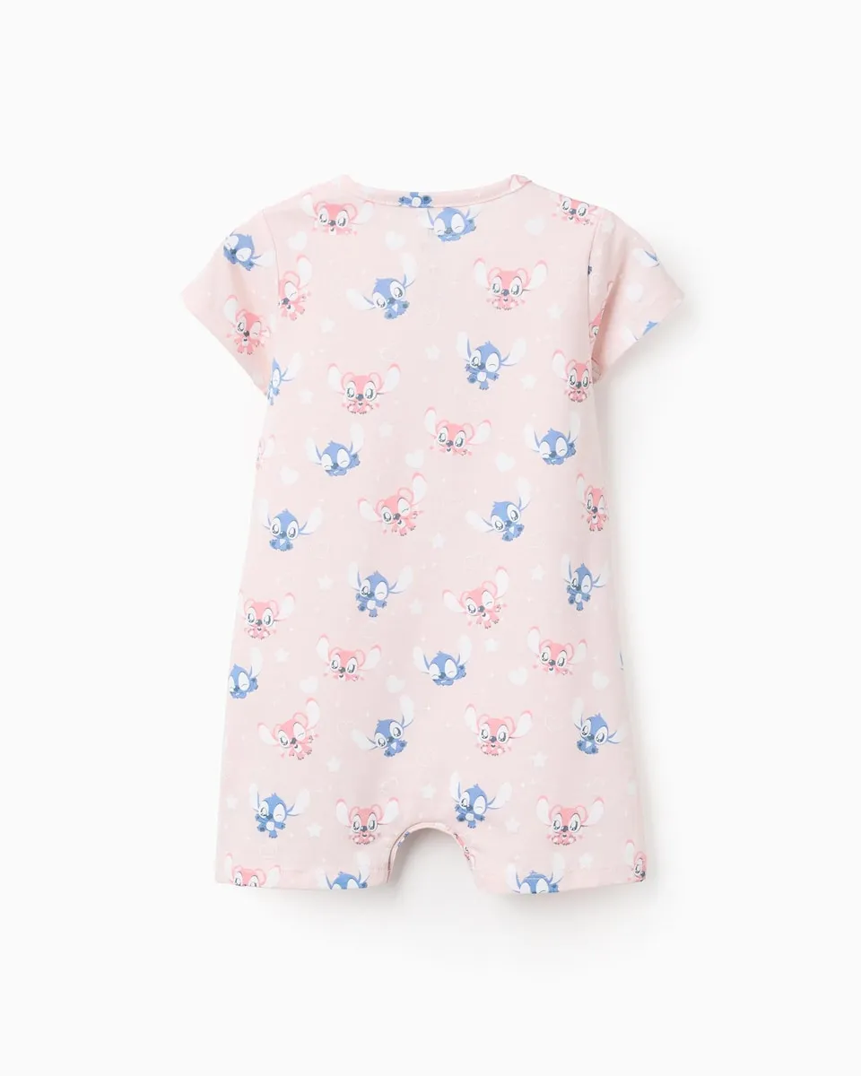 Светло-розовый комбинезон-пижама для девочки, 100% хлопок, с принтом Стич и Энджел. Застегивается на кнопки на плечах и в области шагового шва для легкого переодевания. Внутренняя бирка с принтом, чтобы не раздражать кожу. Идеально подходит для летних ночей!