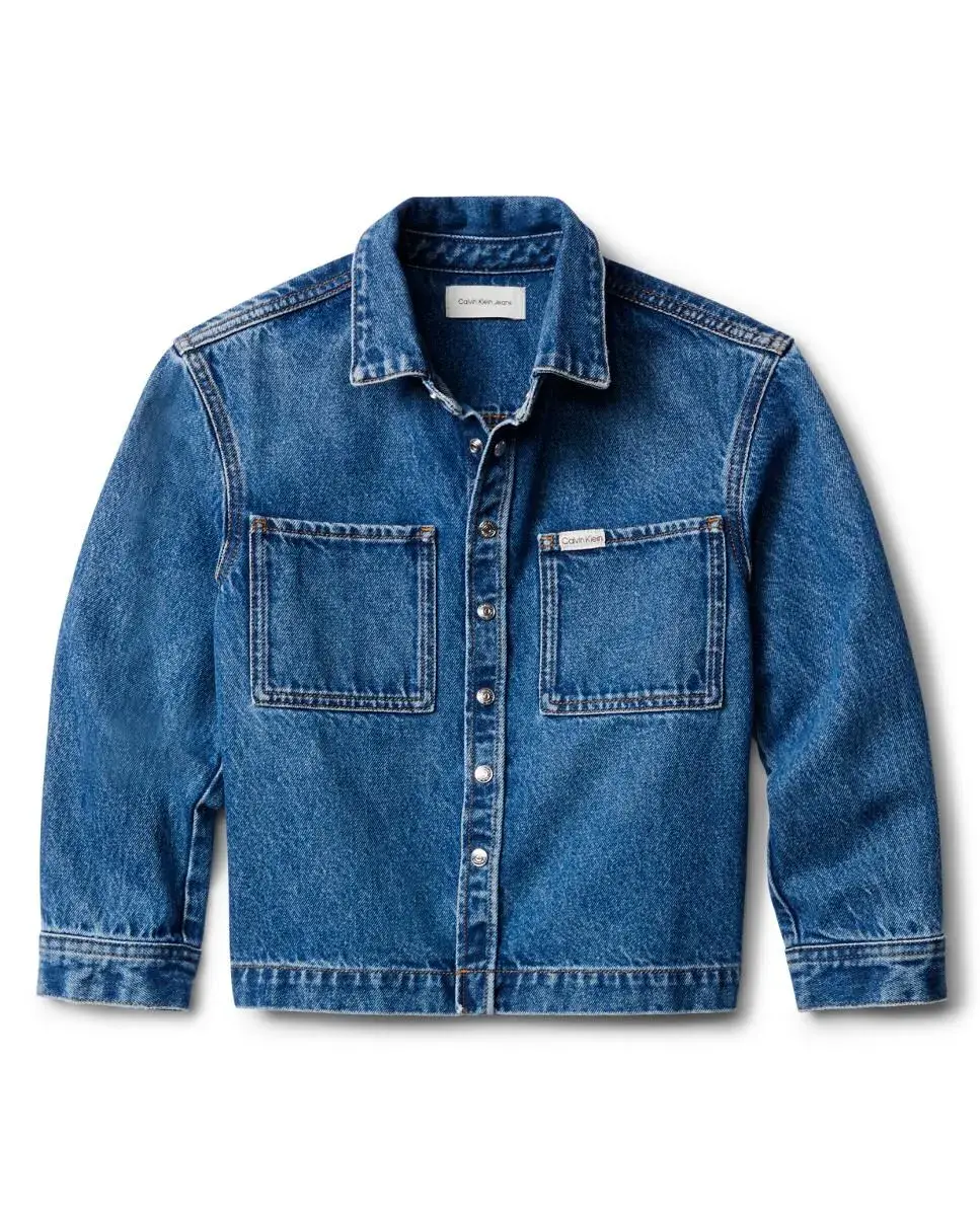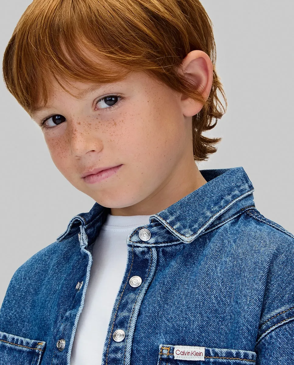 Детская джинсовая рубашка, выполненная из 100% хлопка, с карманами спереди и логотипом CK на груди.