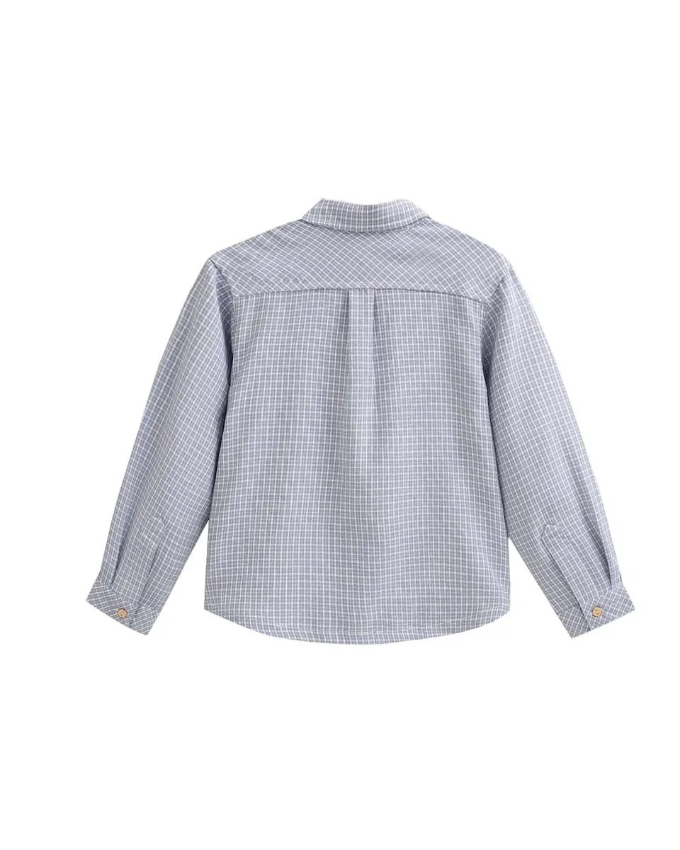 Детская рубашка с принтом в клетку «виши», с V-образным вырезом и застежкой спереди на деревянные пуговицы, удобная и стильная.