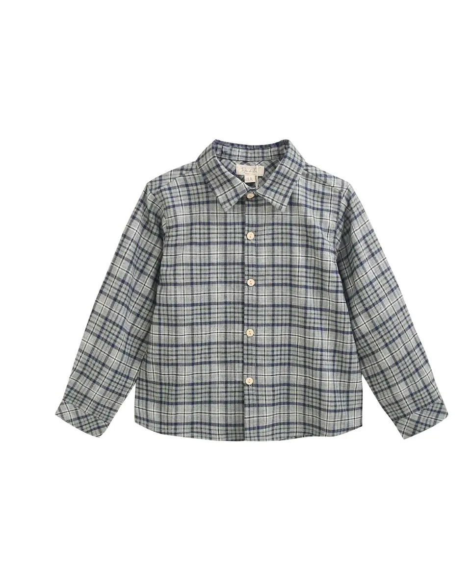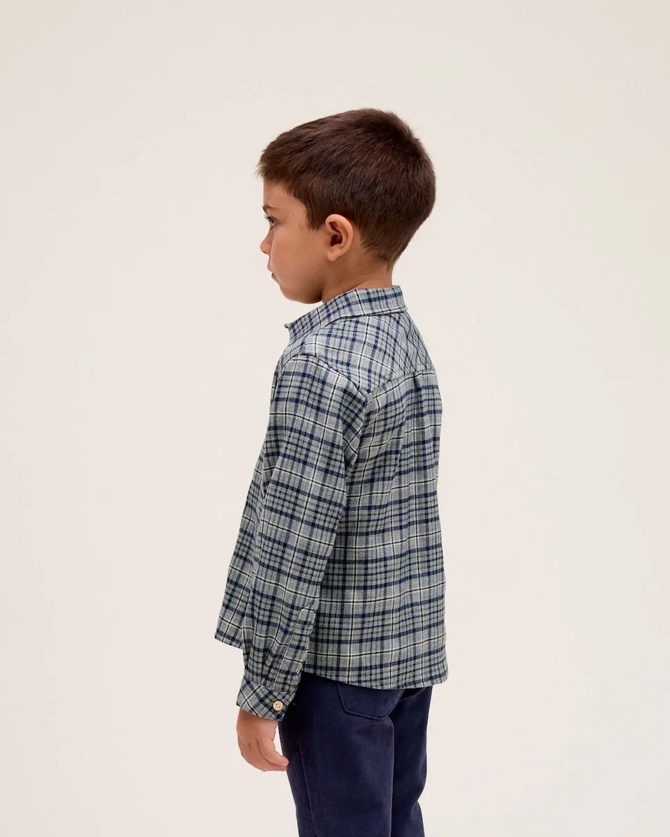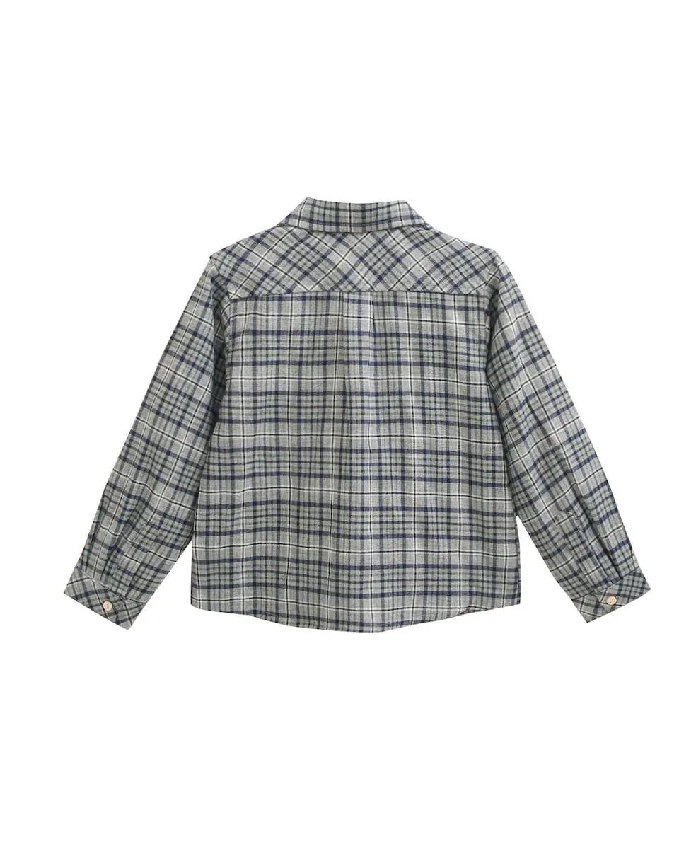 Рубашка для мальчика с длинными рукавами в клетку, с V-образным вырезом и застежкой спереди на деревянные пуговицы, практичная и стильная для повседневного ношения.