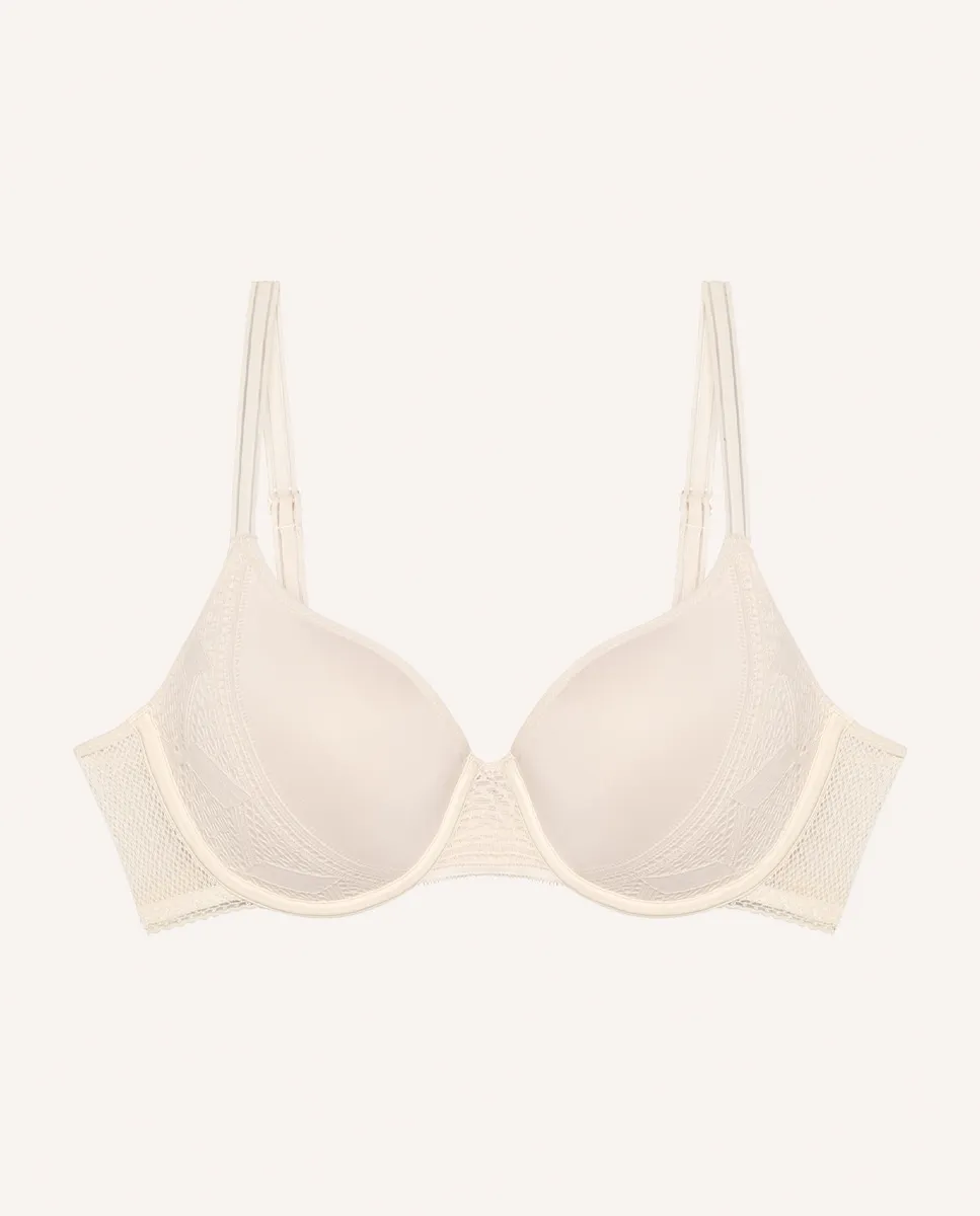 Бюстгальтер с косточками и тонкой формованной чашкой, боковые стороны украшены геометрическим кружевом. Идеально подходит для повседневного использования. Спинка из прозрачного тюля с усилением для максимальной поддержки. Удобные регулируемые бретели. Коллекция Insignia.