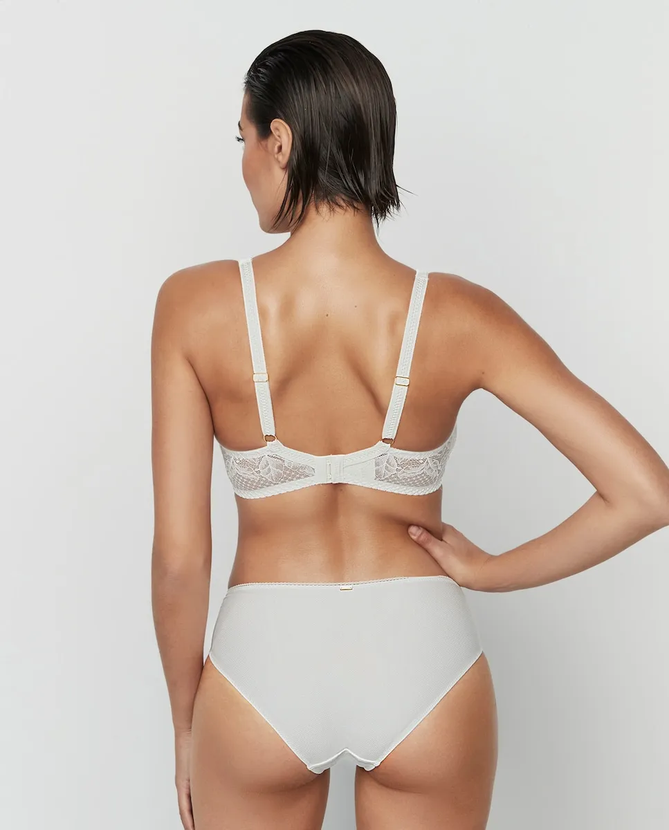 Бюстгальтер без косточек с высокими вырезами и мелкими кружевными деталями. Имеет чашки из поролона. Внутренняя сторона отделана хлопком и оснащена внутренним карманом для протеза, предназначенным для женщин, которым необходимо вставить протез после мастэктомии или опухолевой операции. Бретели имеют два возможных варианта ширины в зависимости от размера, как и застежка, и они оснащены подкладкой для максимального комфорта. Коллекция Malitzia, к которой он принадлежит, представляет собой идеальный танец между нежностью и смелостью.