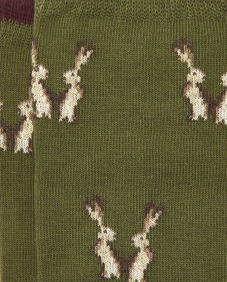 Женский носок средней длины, с животным принтом и изображением зайцев на оливково-зеленом фоне, с комбинированным пяткой и мысом.
