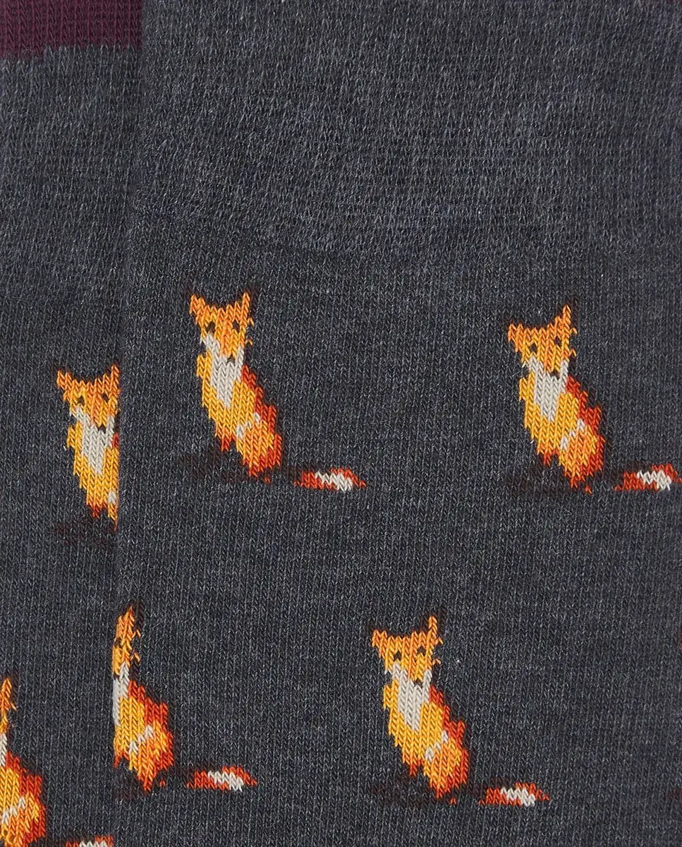 Мужской носок, средней длины, с принтом лисы на сером фоне.