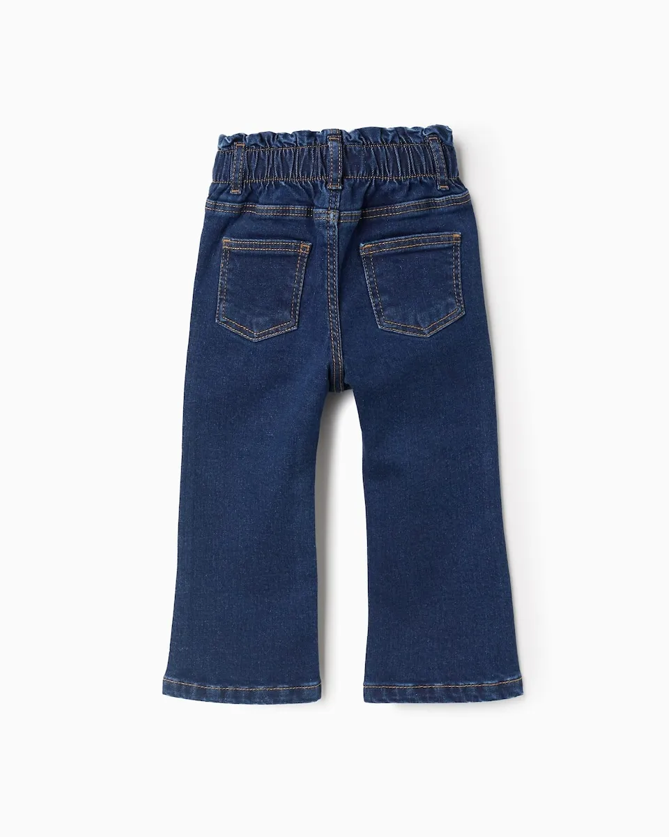 Темно-синие джинсы для маленькой девочки. Расклешенный крой. Эластичный пояс в стиле paperbag, регулируется внутри с помощью резинок и пуговиц. Контрастные швы. Кнопка для быстрой и удобной одевания. Для комфортного и модного образа!
