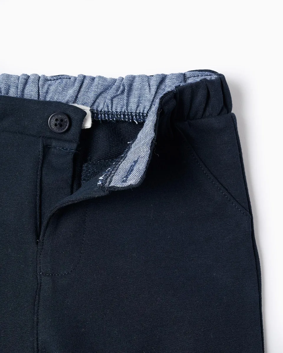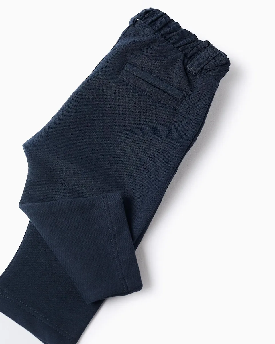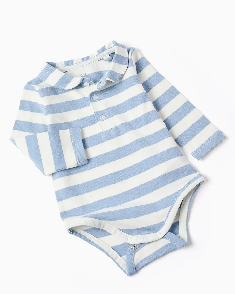 Набор из двух предметов для новорожденных. Включает боди с бело-голубыми полосками и воротником Питер Пэн, а также темно-синие трикотажные штаны. Практичный и удобный комплект для милых образов маленького взрослого!