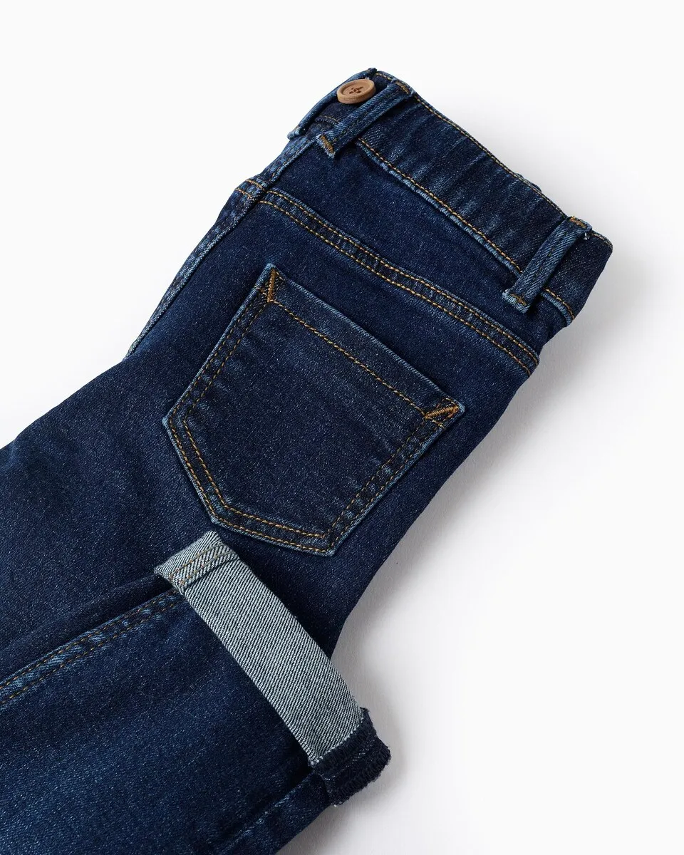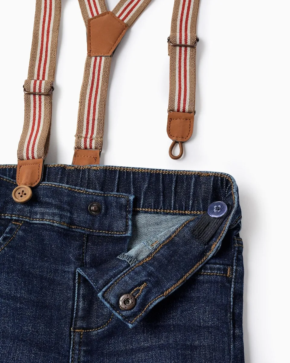 Темно-синие джинсы для маленького мальчика, выполненные из хлопка с добавлением эластана для большего комфорта и свободы движений. Регулируемый пояс с резинкой и пуговицами. В комплекте съемные эластичные подтяжки с полосками. Можно носить вместе или отдельно.