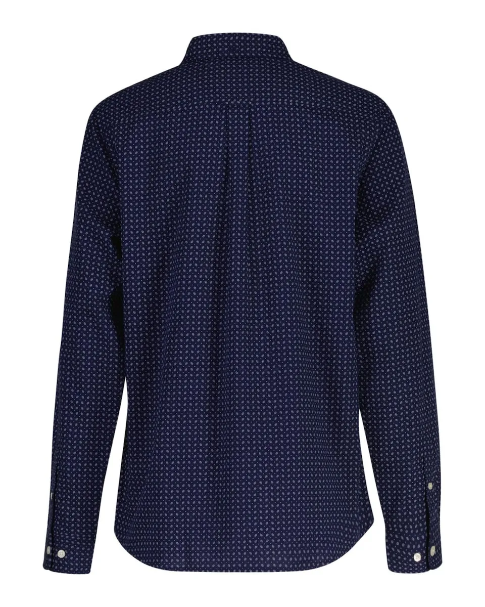 Эта рубашка GANT, выполненная из тонкого хлопкового материала с микропринтом по всей поверхности, является классическим элементом любого «преппи» гардероба. Она разработана с обычным универсальным кроем, имеет длинные рукава, застежку на пуговицы на воротнике и карман на груди с вышитым логотипом бренда. Также рубашка оснащена гравированными пуговицами и складкой со шлевкой на спинке.