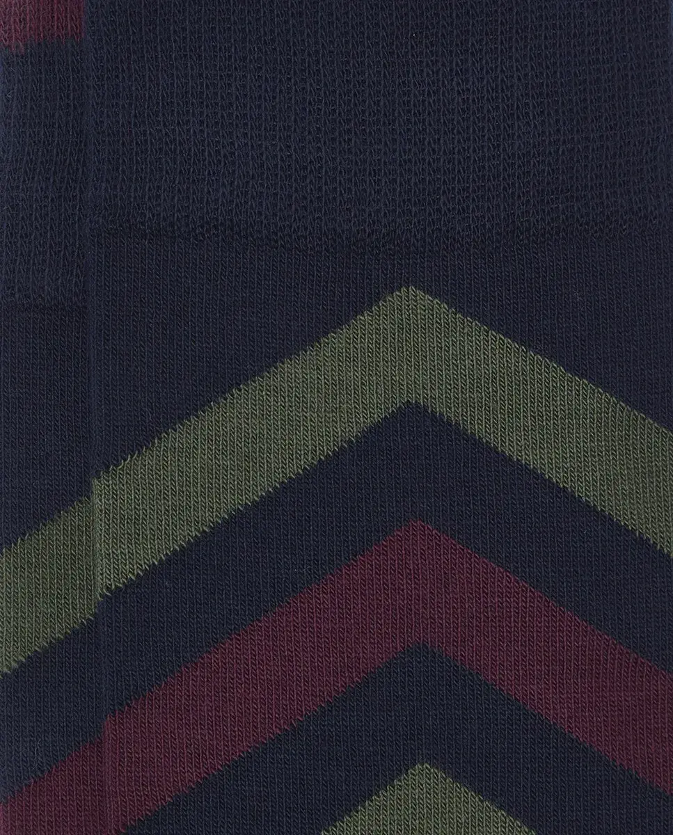 Мужской носок, средняя длина, узор в виде зигзагообразных полос на темно-синем фоне.