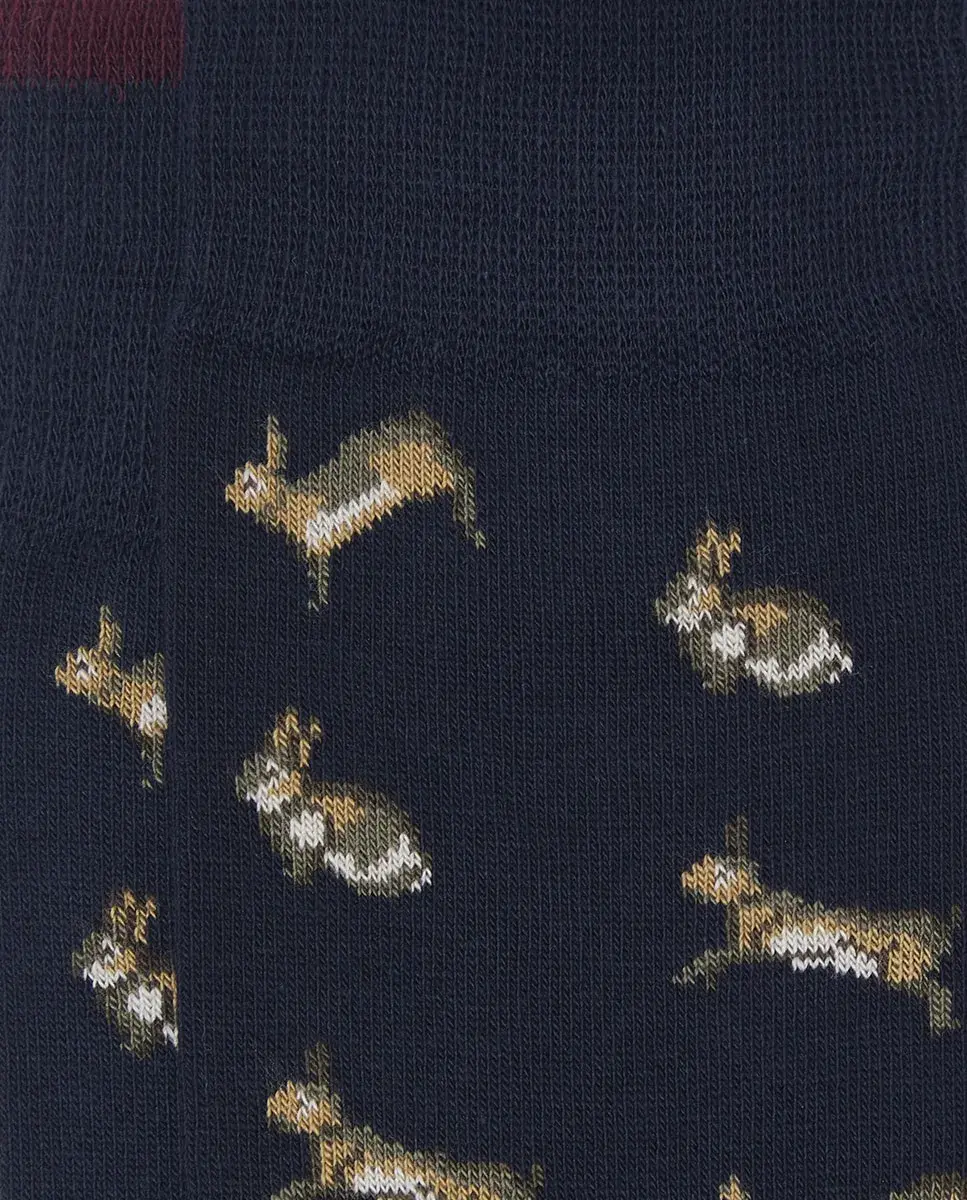 Мужской носок, средняя длина, с принтом животных с последовательностью кроликов на темно-синем фоне.
