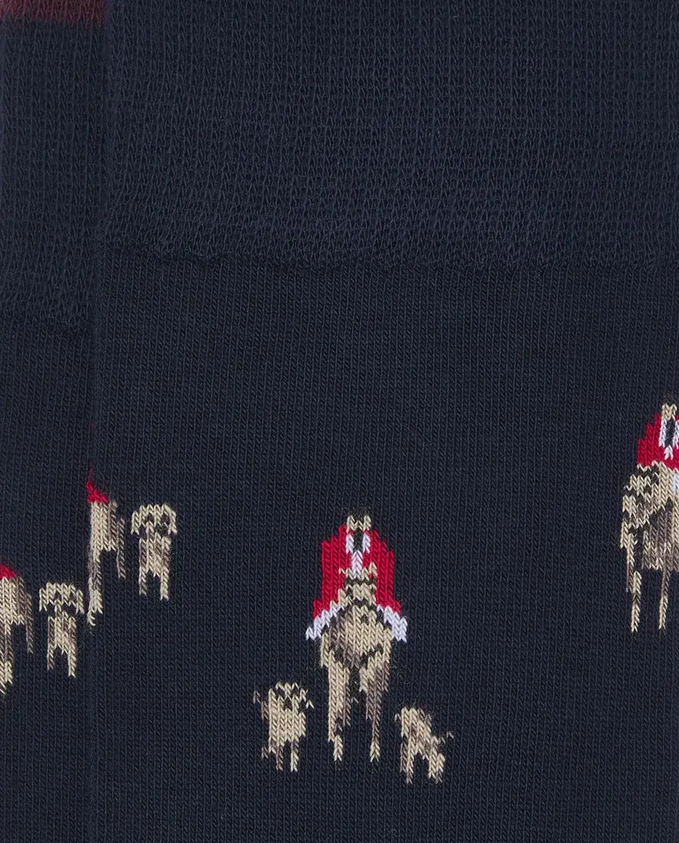 Мужской носок, средней длины, с принтом охотничьей лисы на темно-синем фоне.