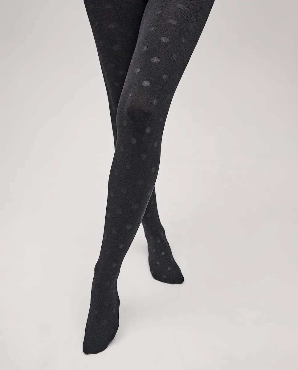 Термоколготки 140 ден с эффектом сетки, с мягкой флисовой внутренней частью. Эта модель с рисунком в горошек. 95% полиэстер, 5% эластан