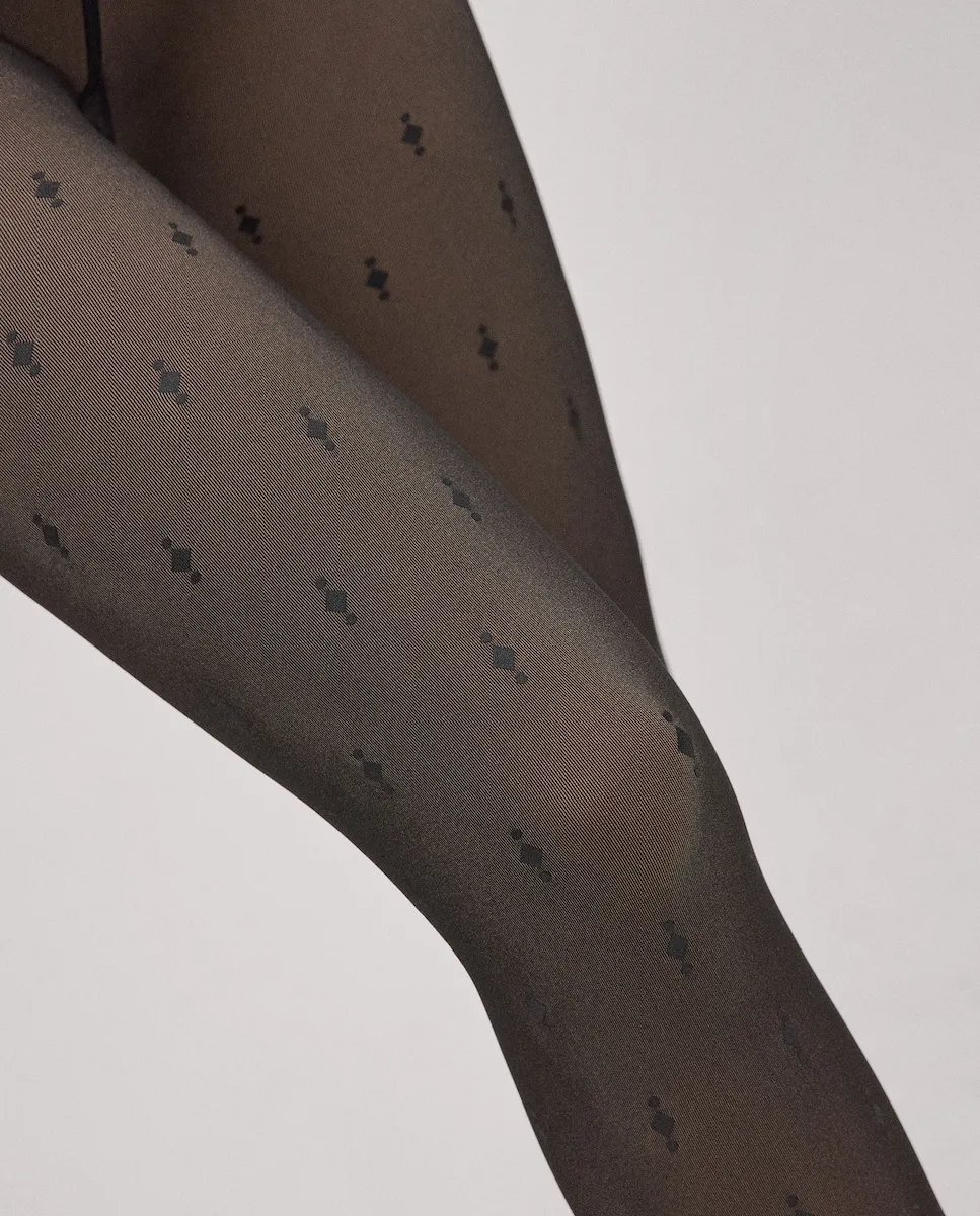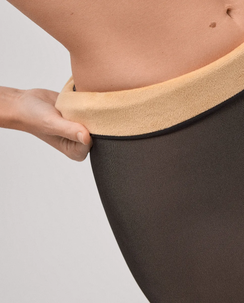 Прозрачные термо-колготки 160 ден с эффектом затемнения, с мягкой внутренней стороной. Эта модель с геометрическим узором. 85% полиэстер, 15% эластан