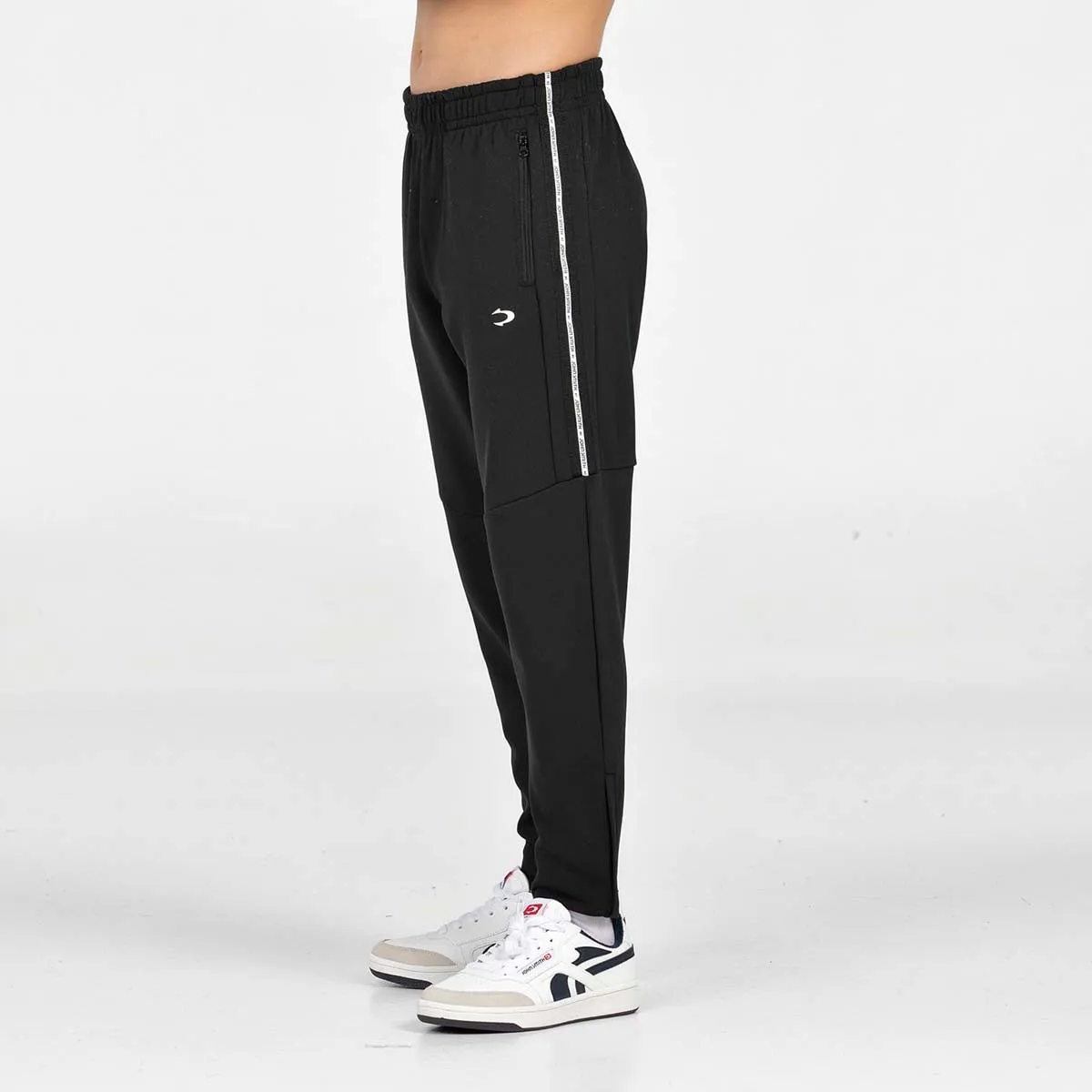 Длинные брюки с зауженными штанинами, боковыми карманами на молнии, индивидуальными вставками, молнией на низе и тисненным логотипом на бедре.