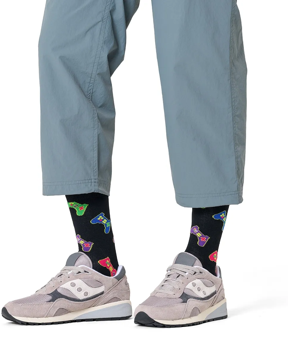 Длинные носки с изображением игрового пульта на черном фоне.