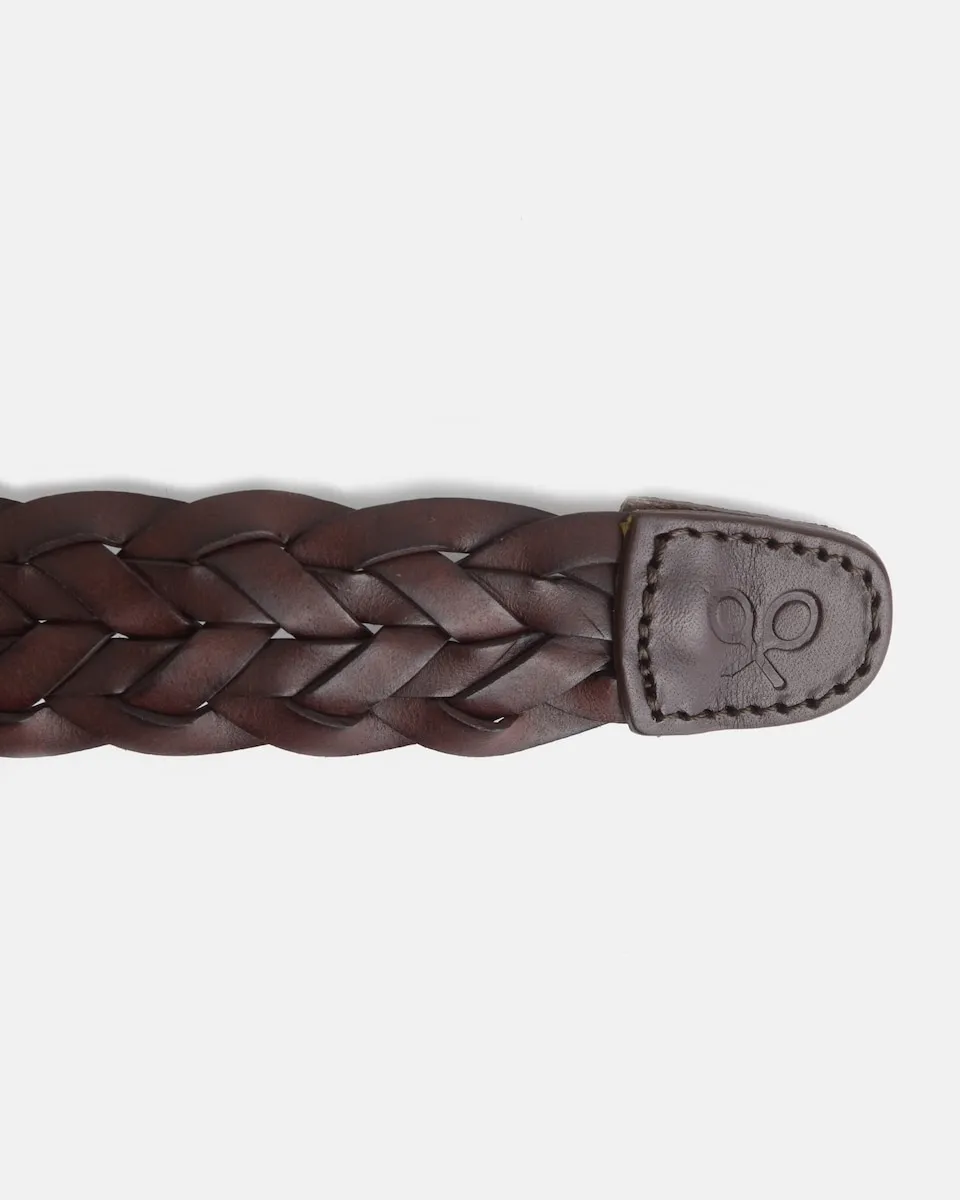 Плетеный пояс, изготовленный из 100% кожи. Имеет застежку с пряжкой цвета старого золота. На конце украшен выгравированными ракетками. Сделано в Испании.