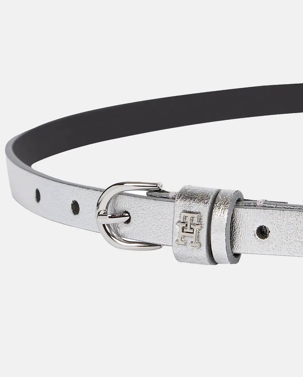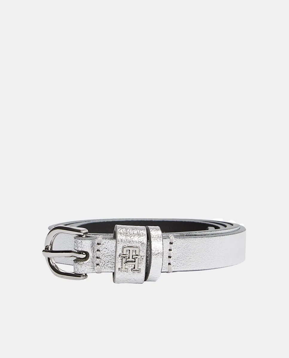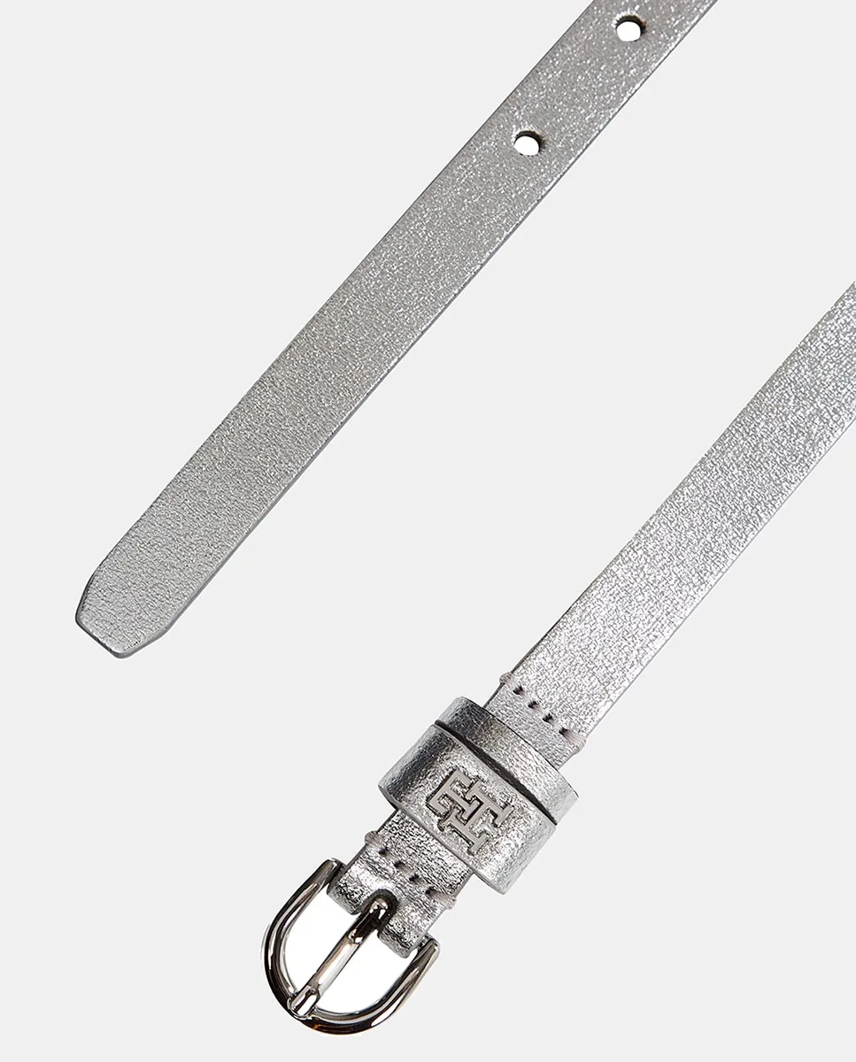 Женский ремень из кожи серебристого цвета. Дизайн с логотипом Tommy Hilfiger на пряжке.