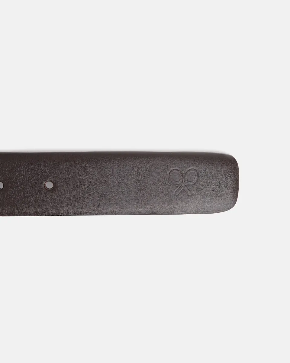 Темно-коричневый ремень, изготовленный из 100% кожи. Имеет застежку с пряжкой цвета старого золота. На конце украшен гравировкой ракеток. Скуфита изготовлена в Испании.