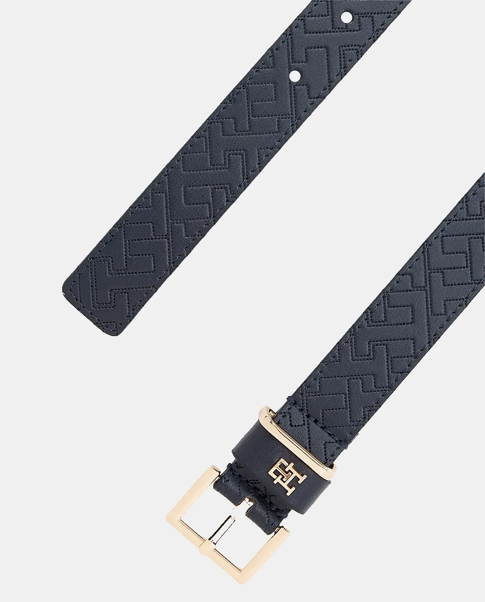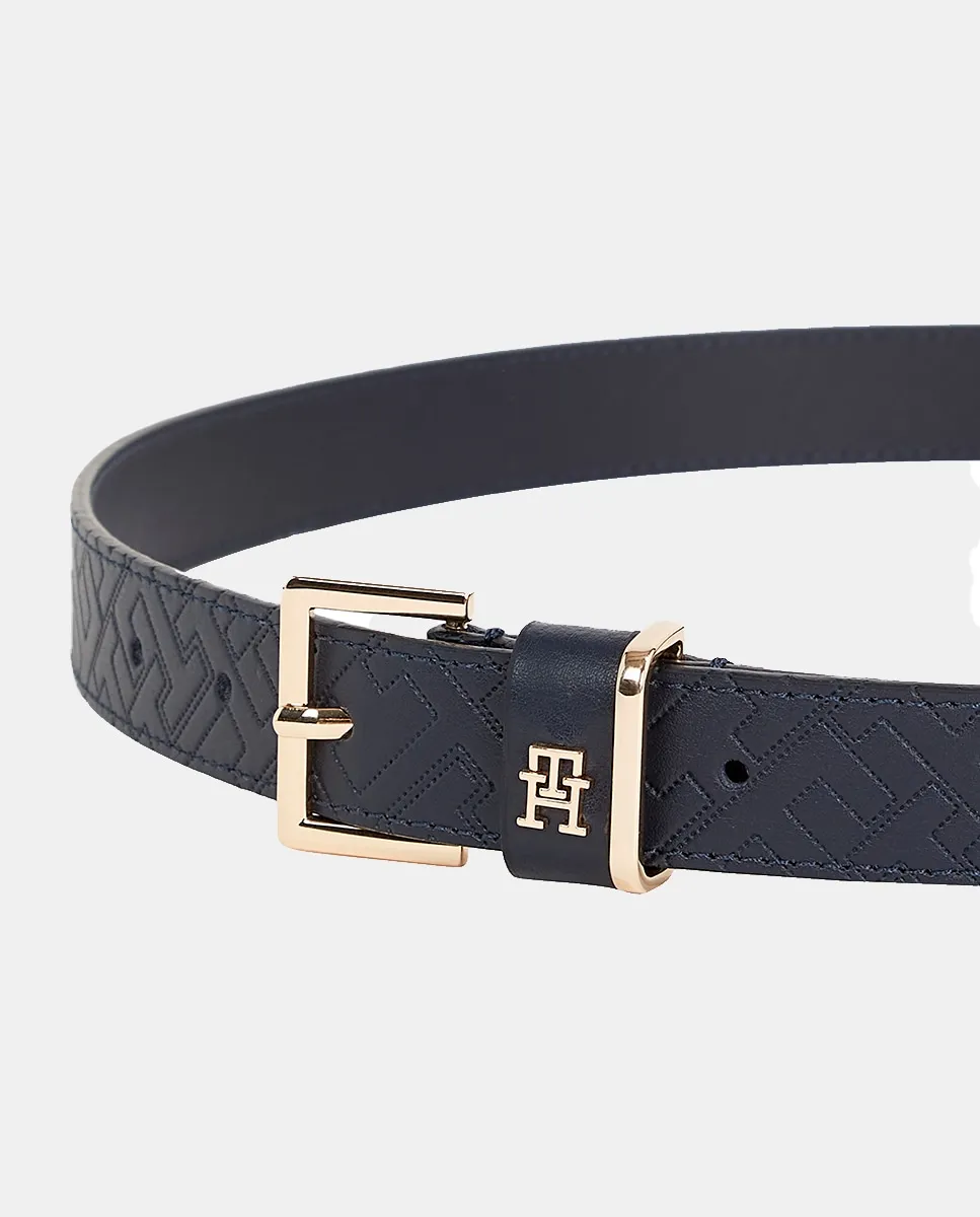 Женский ремень, изготовленный из кожи, с монограммой Tommy Hilfiger, темно-синего цвета. Дизайн с квадратной пряжкой.