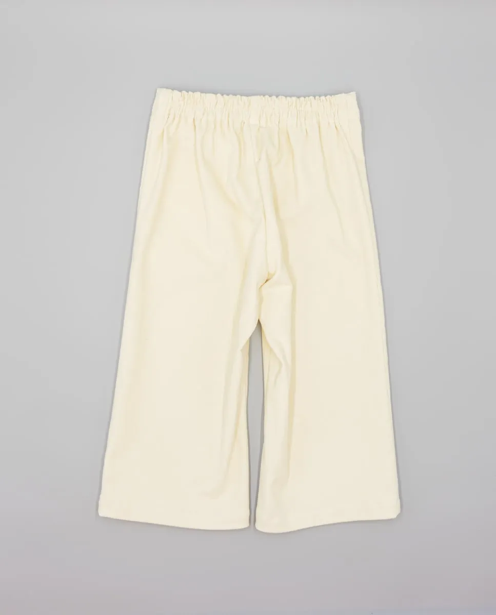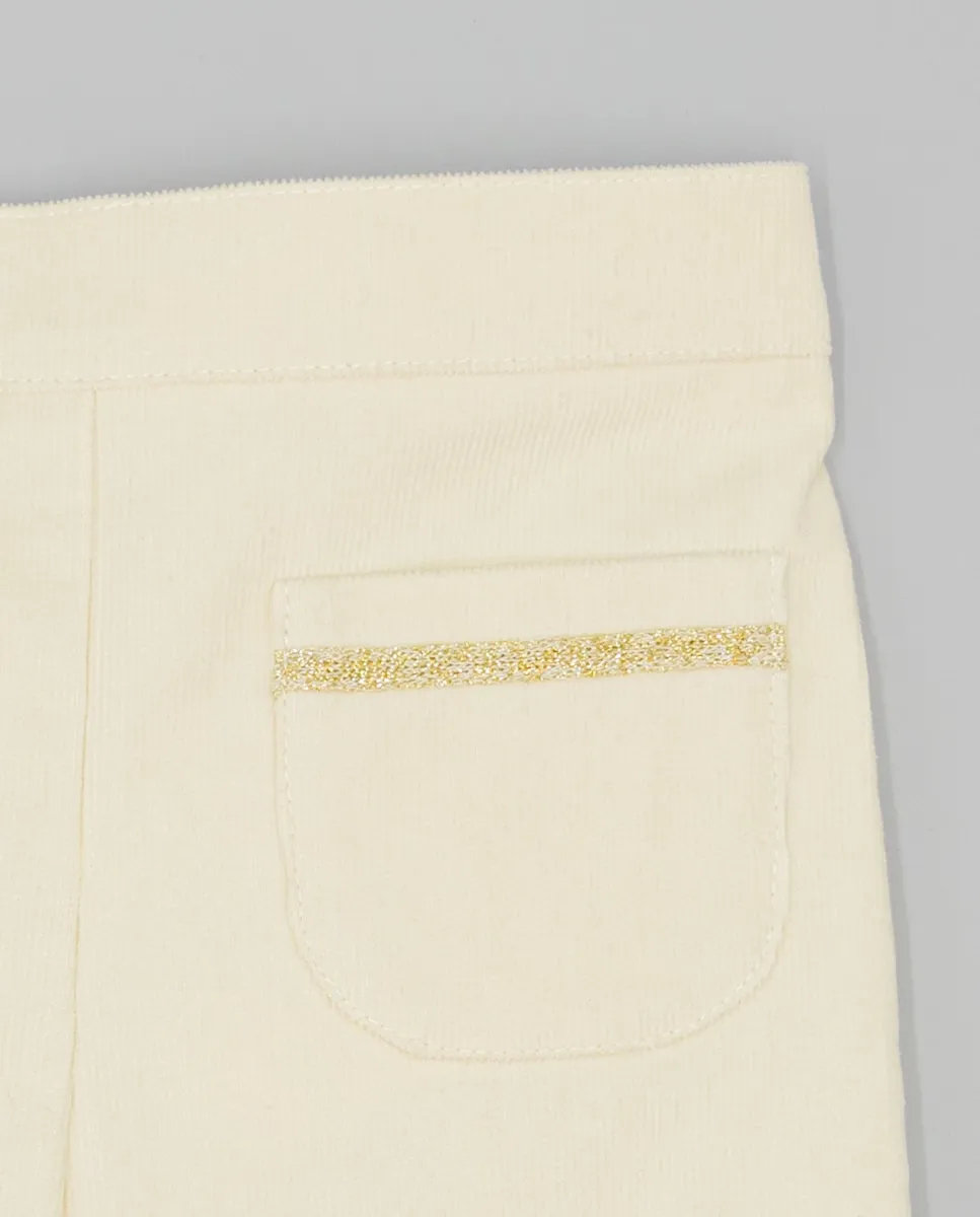 Бежевые вельветовые брюки для девочки с накладными карманами и отделкой из металлической пряжи. Пояс с резинкой сзади для комфортной посадки. Ткань 100% хлопок, мягкая и прочная. Доступны размеры от 2 до 16 лет.
