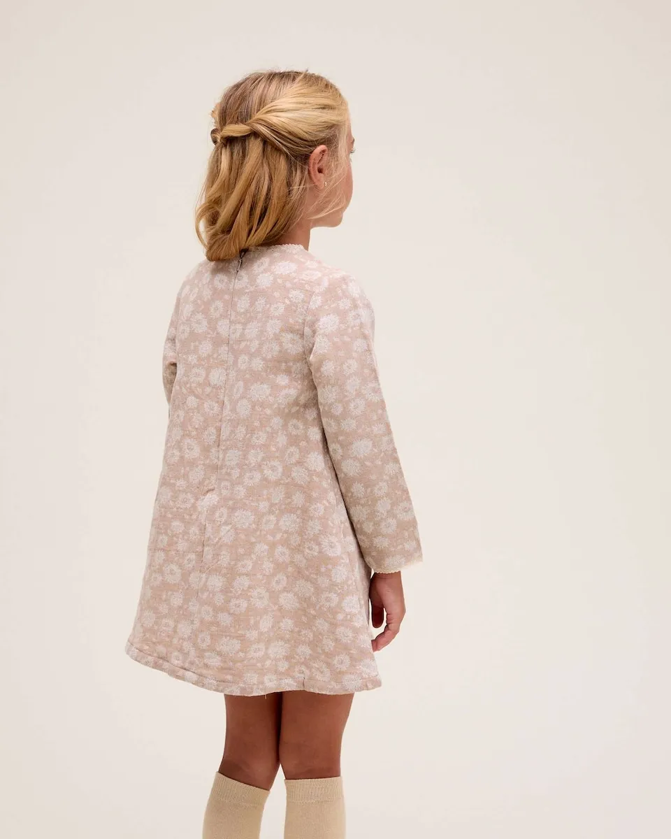 Платье для девочки трапециевидного силуэта с белым цветочным принтом, с длинными рукавами, кружевом на воротнике и манжетах, с подкладкой и скрытой застежкой-молнией сзади.