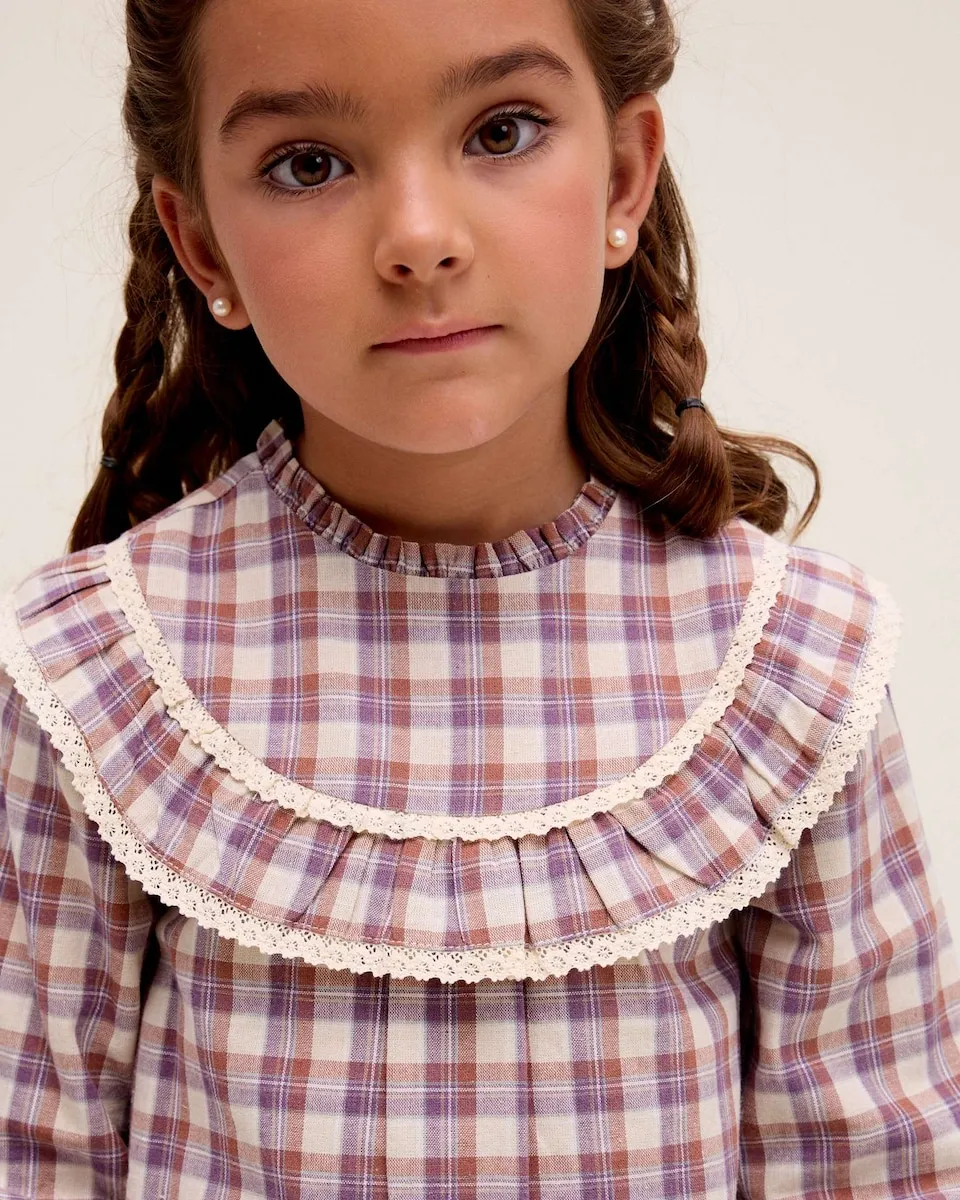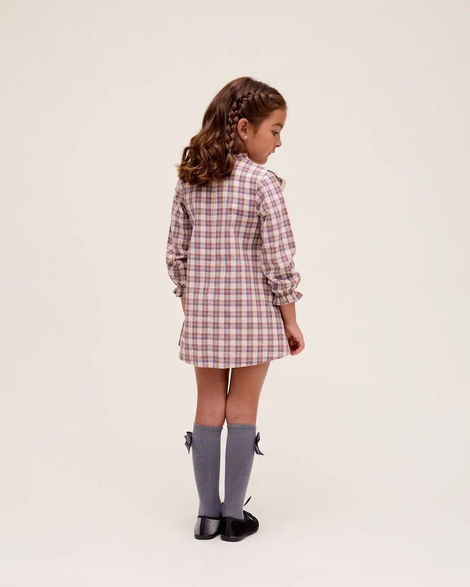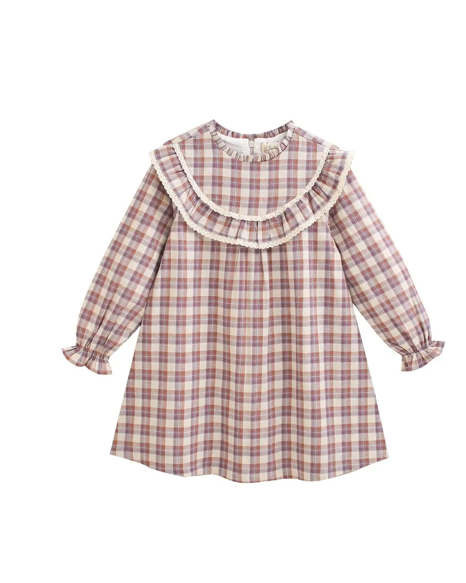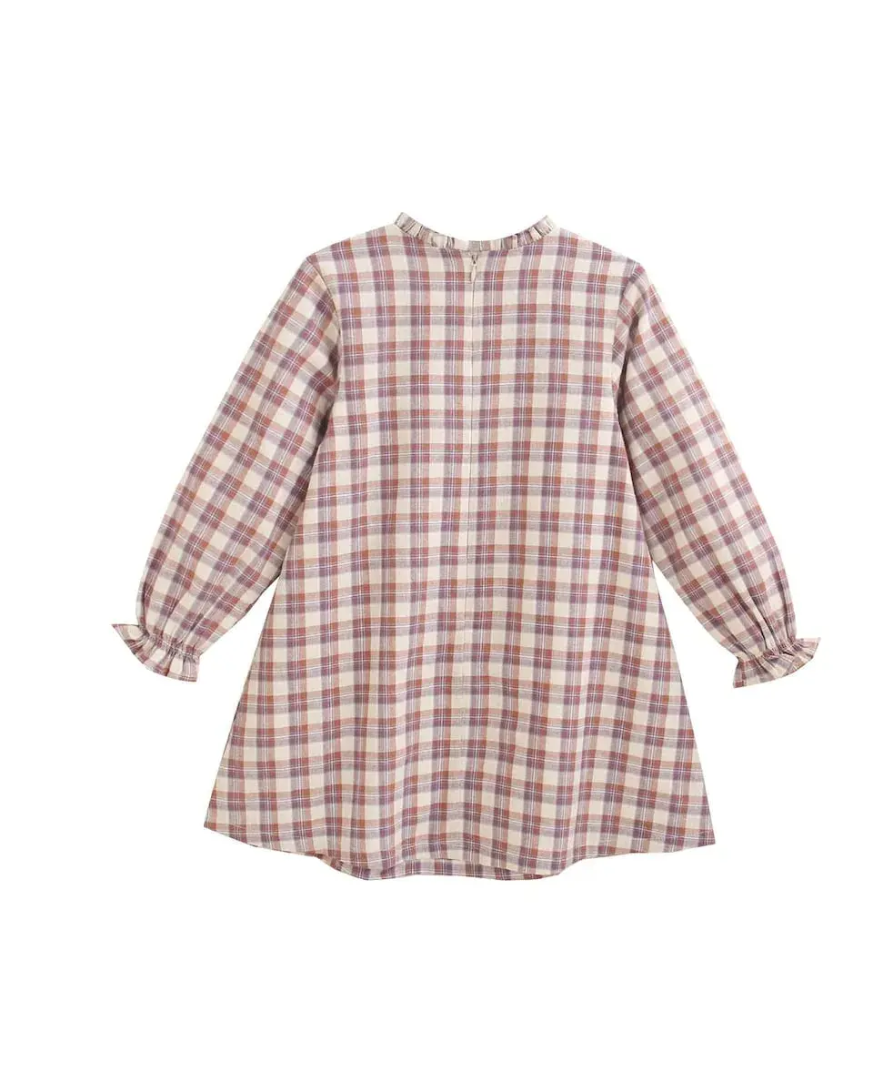 Платье для маленькой девочки с расклешенной юбкой в клетку, с длинными рукавами с эластичными манжетами, с запрессовкой на воротнике и рюшами спереди.