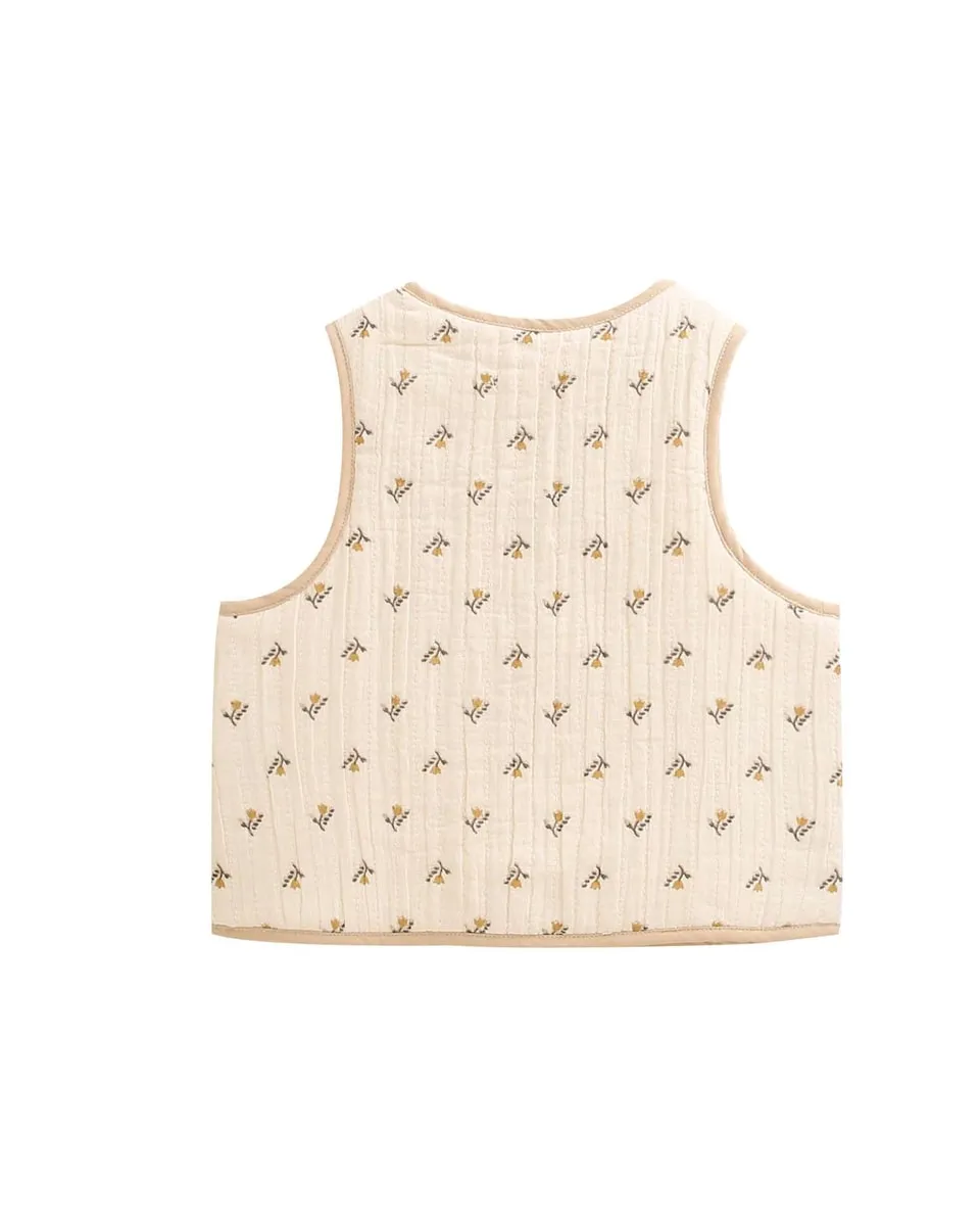 Детский жилет для девочки с цветочным принтом и отделкой, передними карманами и стеганой текстурой, теплый, удобный и стильный.