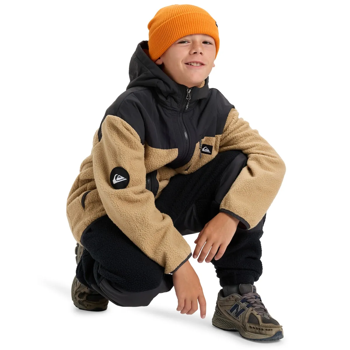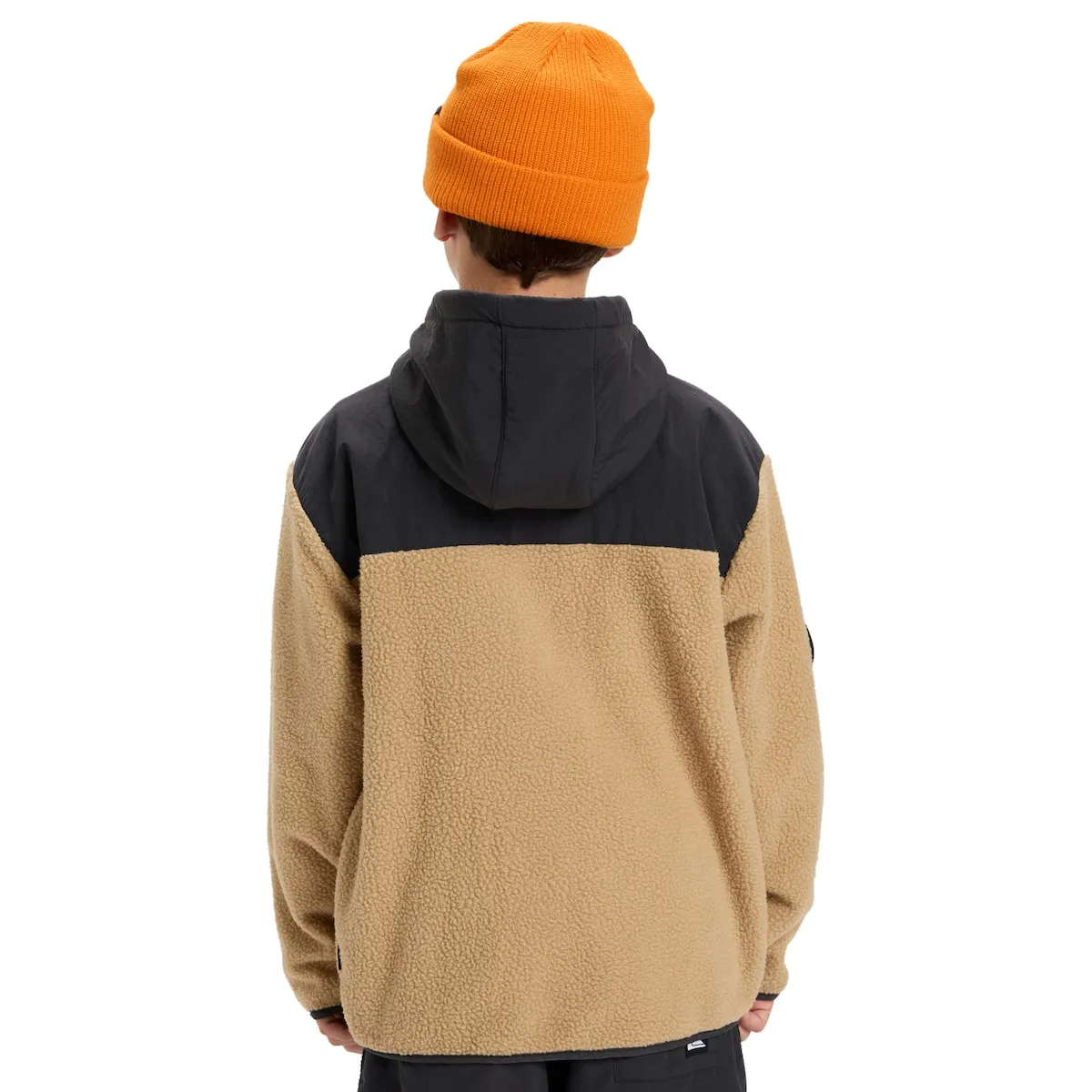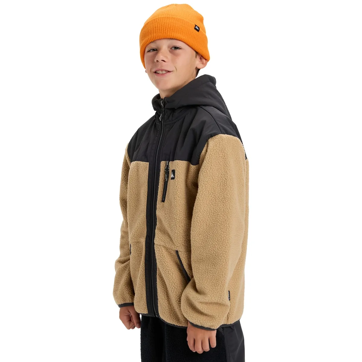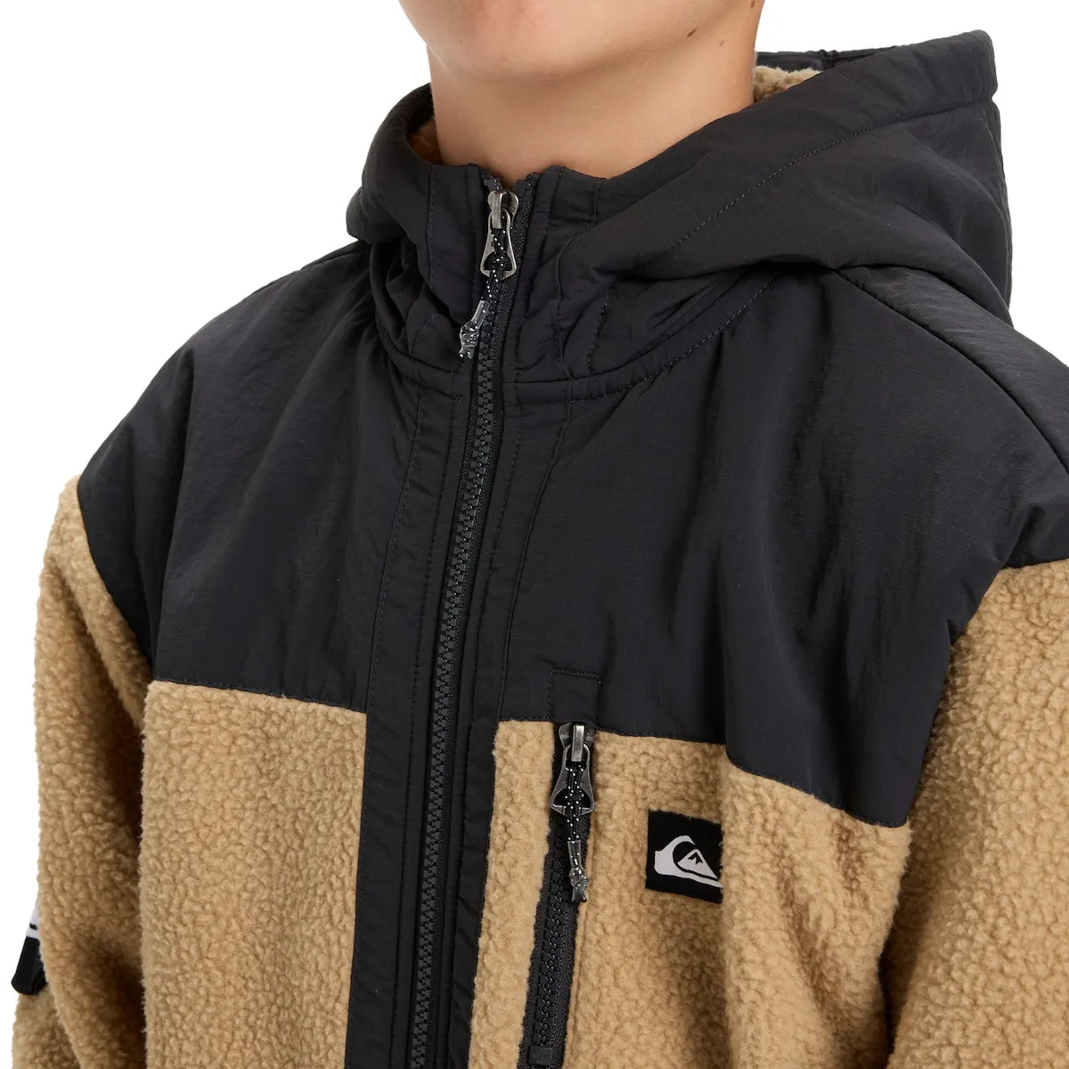 Флисовая куртка на молнии для детей 8-16 лет. Характеристики включают: Ткань: переработанный полиэстер, Покрой: оверсайз, Накладывающийся капюшон и кокетка, Карманы-кенгуру, Карман на груди на молнии, Дополнительные детали: бренд Quiksilver и съемная специальная нашивка на липучке.