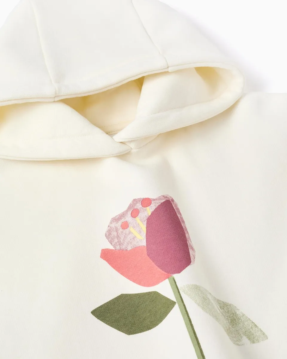 Белая толстовка для девочки с передним принтом в виде цветка. Из хлопковой смеси, для мягкости и комфорта. С начесом внутри для тепла. С капюшоном. Опущенные плечи для расслабленного вида. Рифленые края для идеальной посадки. Удобная толстовка, идеально подходящая, чтобы добавить стиль в самые холодные дни!