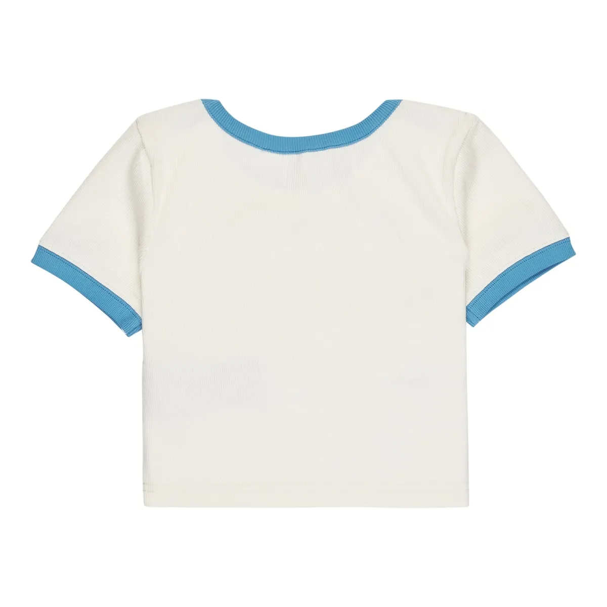 Футболка облегающего кроя для детей 4-16 лет. Особенности включают: Ткань: трикотажный хлопок с эластаном, Крой: короткий облегающий, Вырез: круглый вырез, Контрастные элементы на воротнике и низе рукавов, Детали Roxy на груди.
