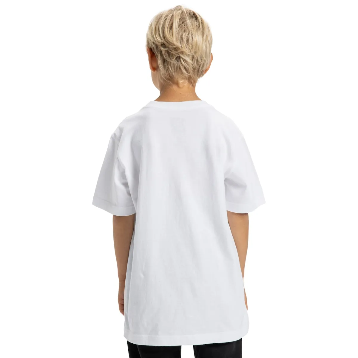 Футболка с коротким рукавом для детей 8-16 лет. Характеристики включают: ткань: хлопок, трикотаж из переработанного хлопка [200 г/м²], стандартный крой, круглый вырез, объемные шелкографические принты Plastisol на передней части, шелкографическая бирка в центре затылка и прикрепленная бирка на подоле.