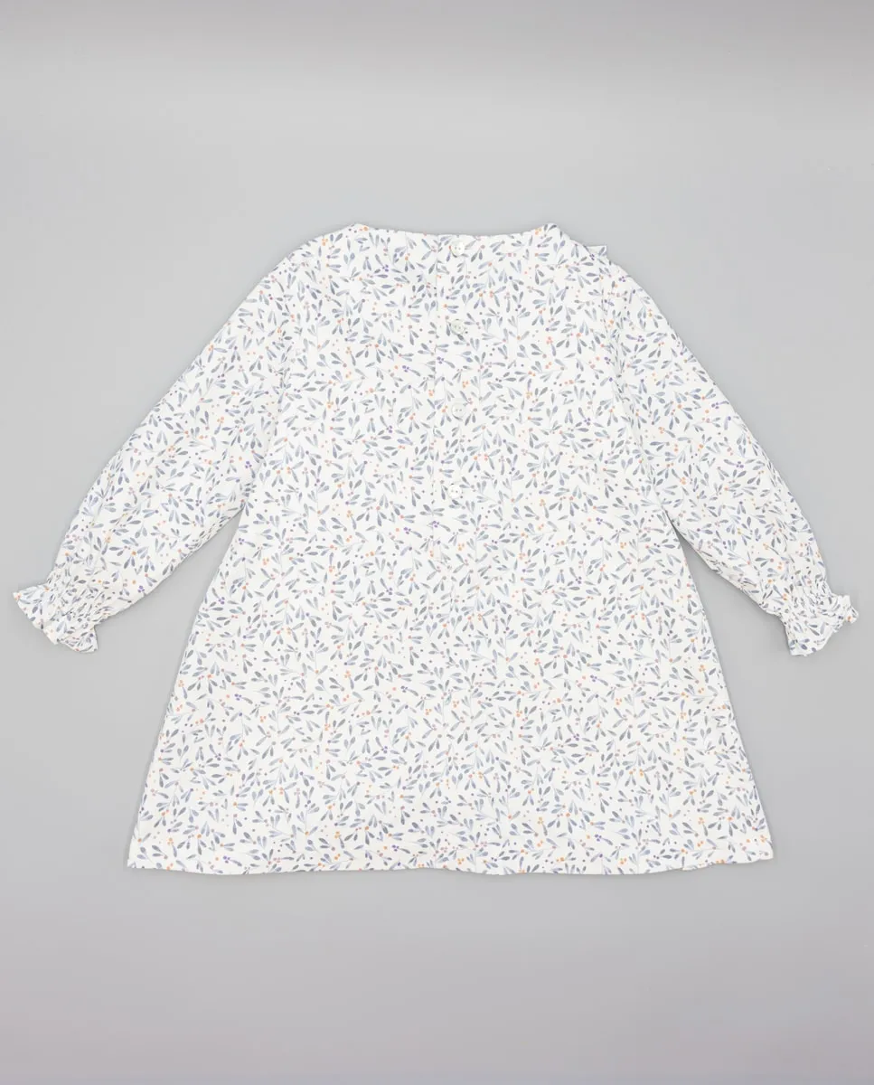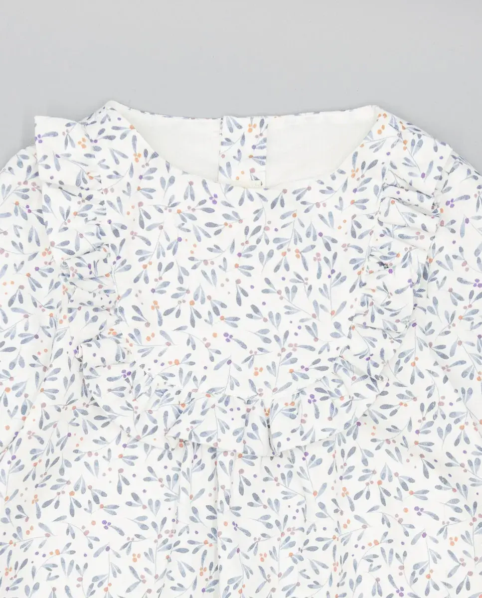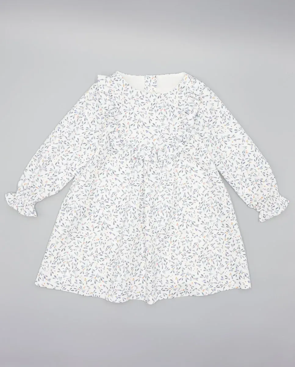 Платье для девочки из вельвета с принтом в виде листьев. Расклешенный крой, длинные рукава с эластичными манжетами, образующими волан, и круглый вырез. Волан на лифе создает сборку спереди. Подкладка из 100% хлопка. Доступно в размерах от 2 до 16 лет.