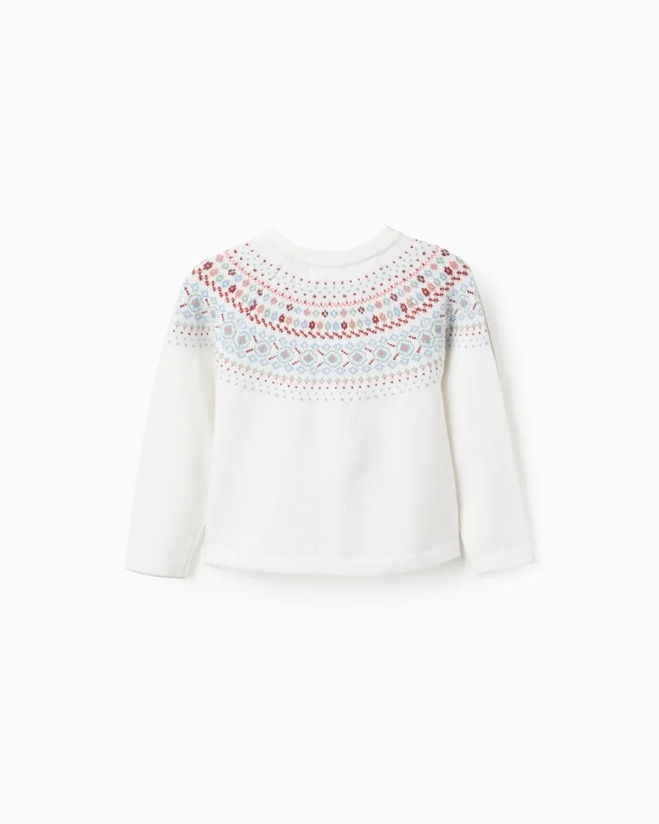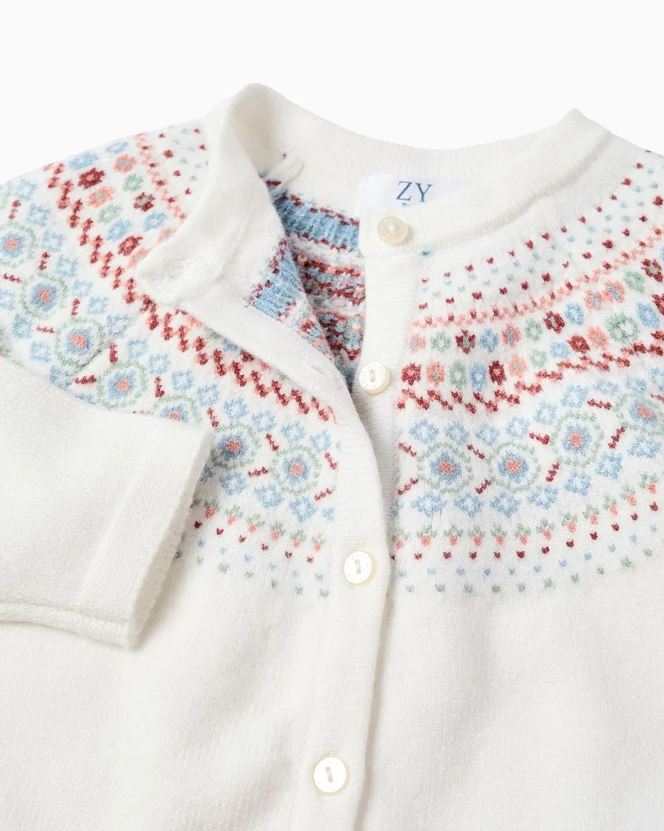 Белый вязаный кардиган для маленькой девочки с многоцветным жаккардом на груди и вокруг плеч. Клешенный крой. Мягкая и уютная вещь с традиционным акцентом.