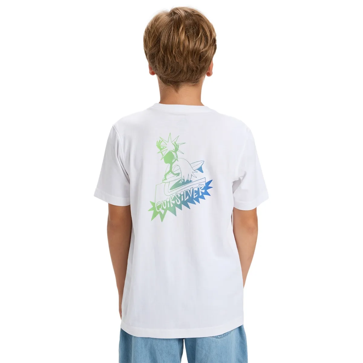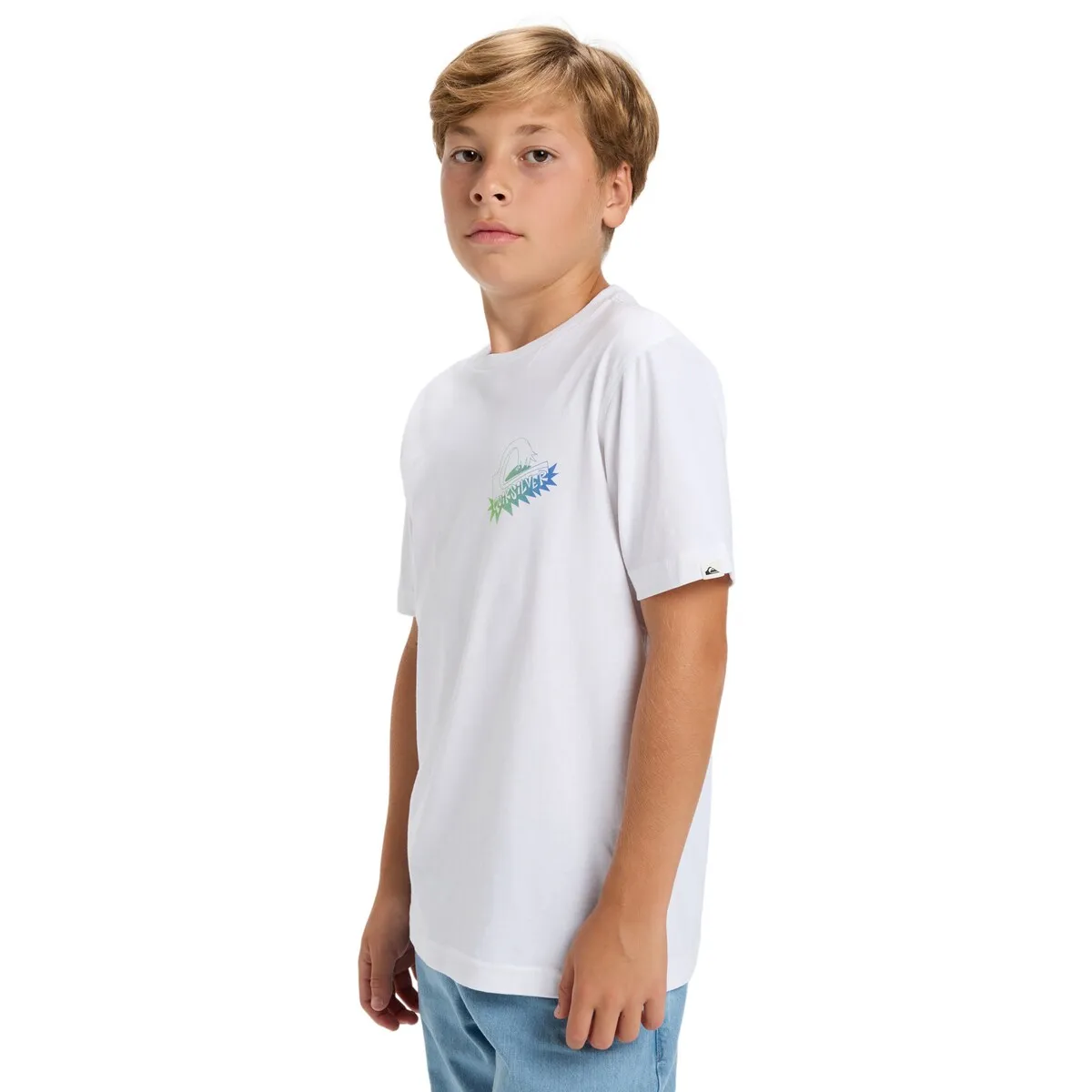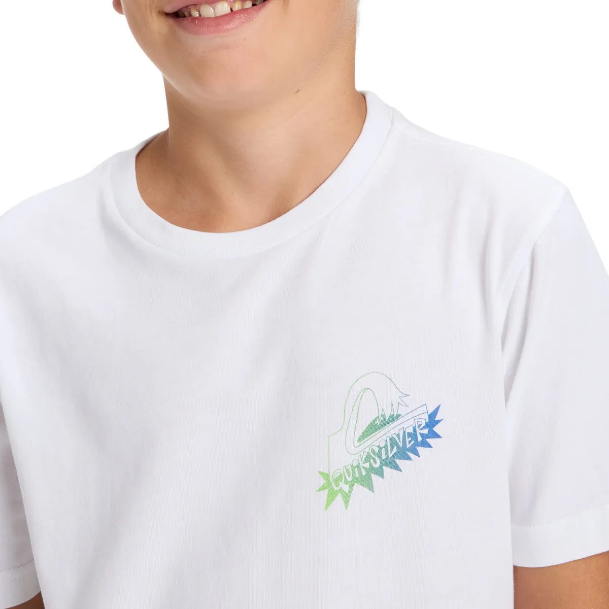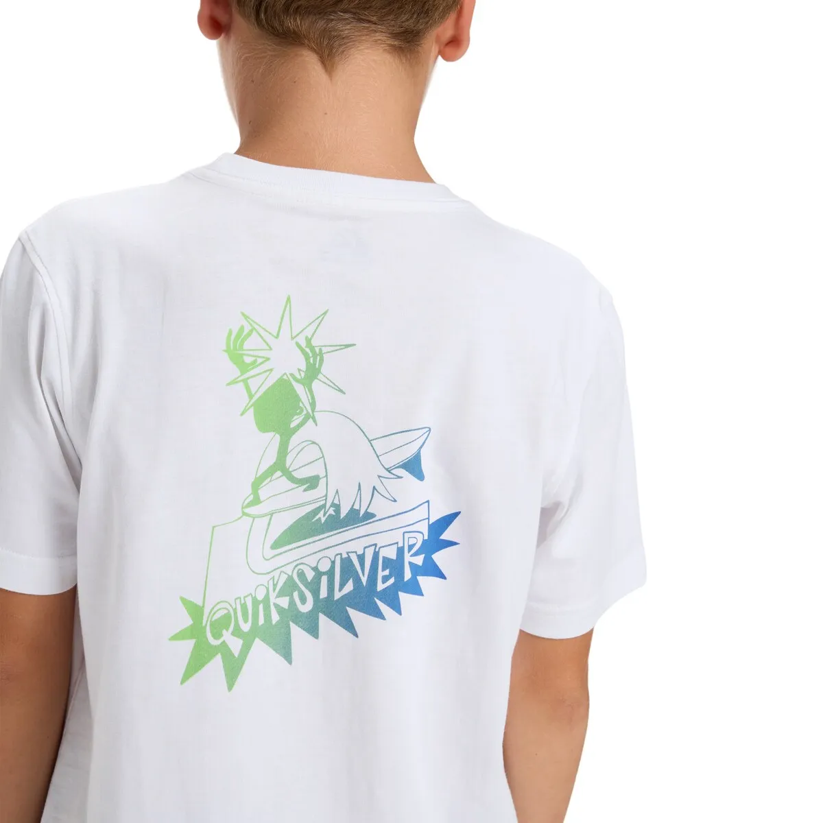 Футболка с короткими рукавами для детей 8-16 лет. Характеристики включают: Материал: хлопковый трикотаж [160 г/м²], Крой: обычный, Воротник: круглый, Принт на груди и спине, Бирка Quiksilver на подоле рукава.