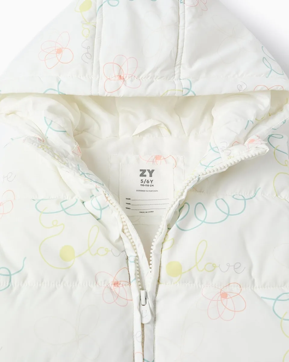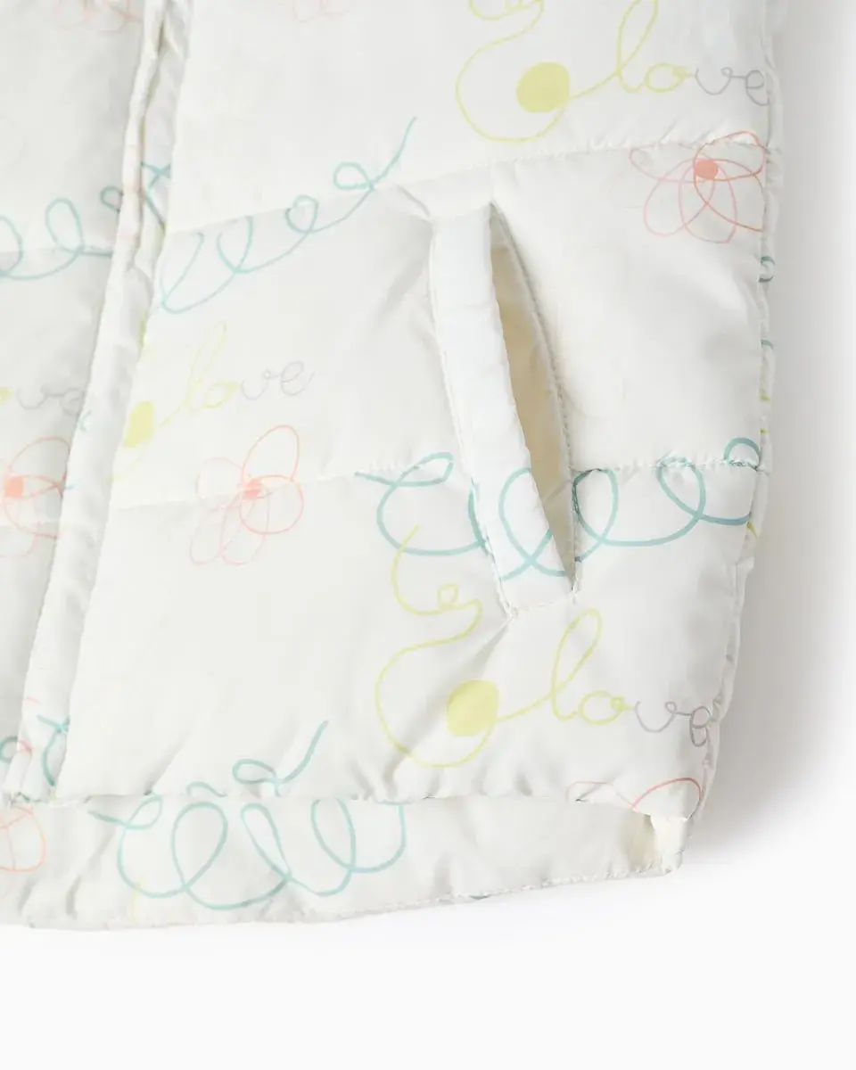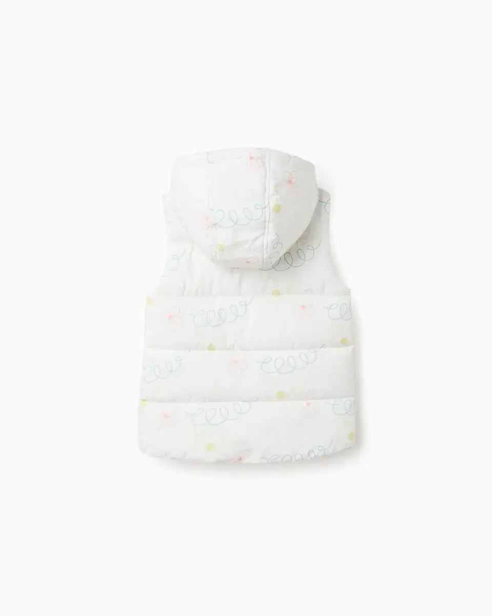 Белый стеганый жилет для девочки с рисунком и капюшоном. Боковые карманы. Застежка-молния для легкого одевания. Внутренняя этикетка для имени девочки. Мы заботимся: эта одежда наполнена переработанным полиэстером. Идеально подходит для игр в парке!