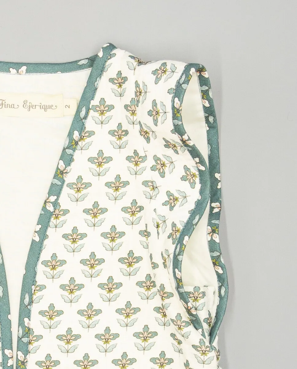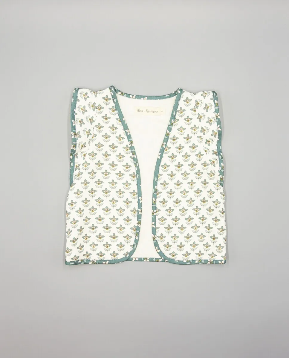Зеленый стеганый жилет из велюра с цветочным принтом для девочки, с контрастной окантовкой из той же цветочной ткани. Подкладка из 100% хлопка. Доступен в размерах от 2 до 16 лет.