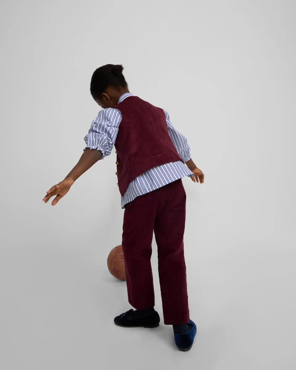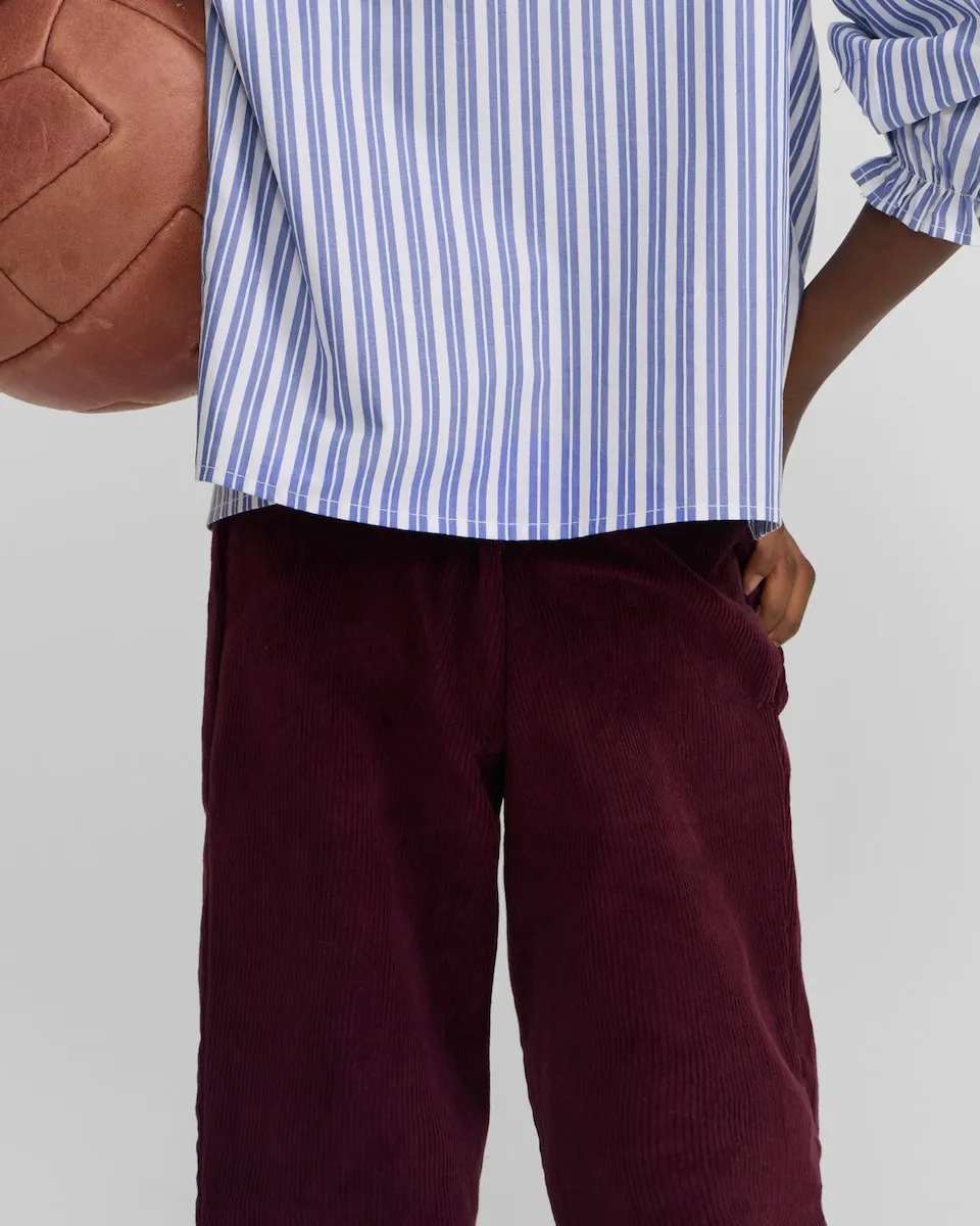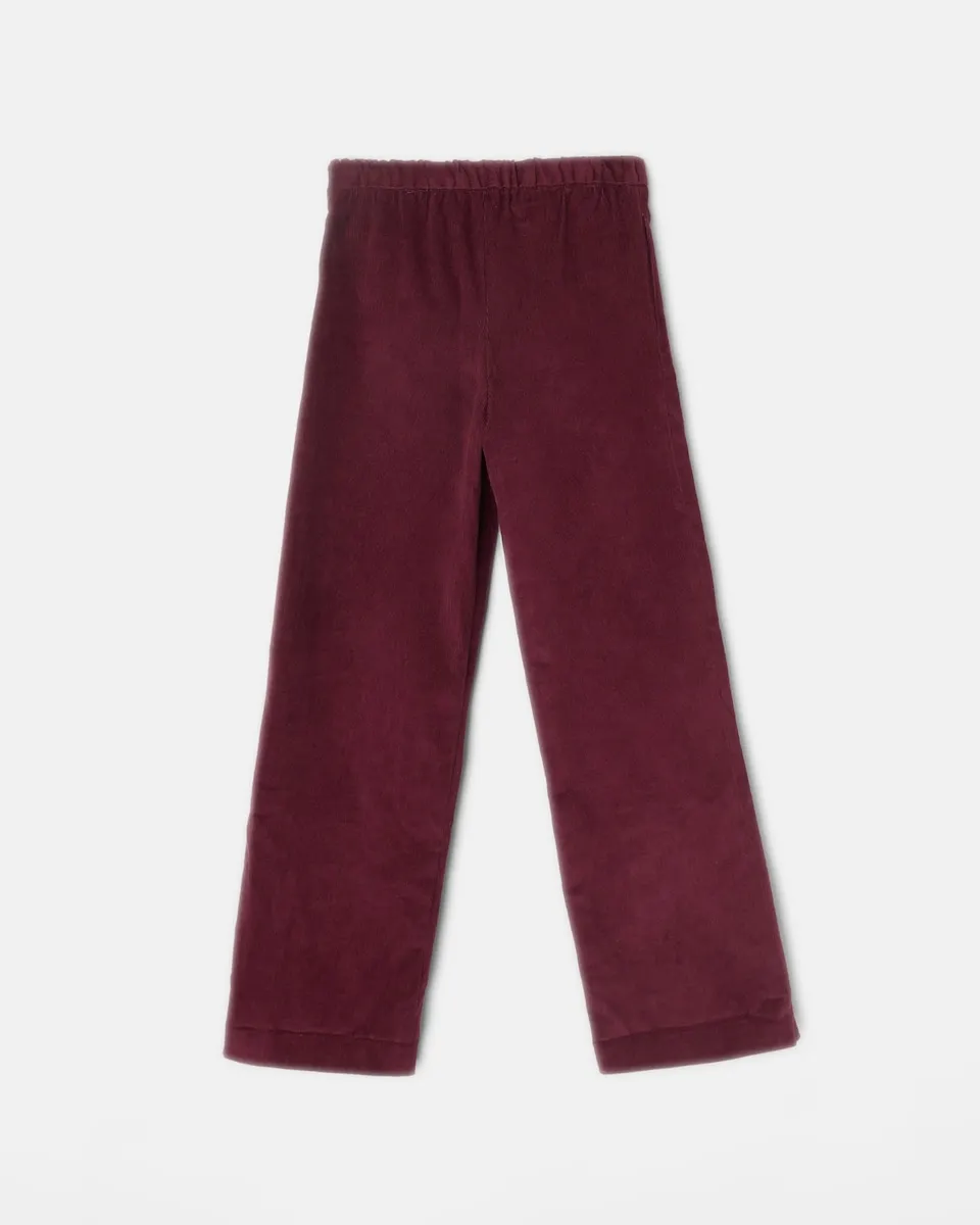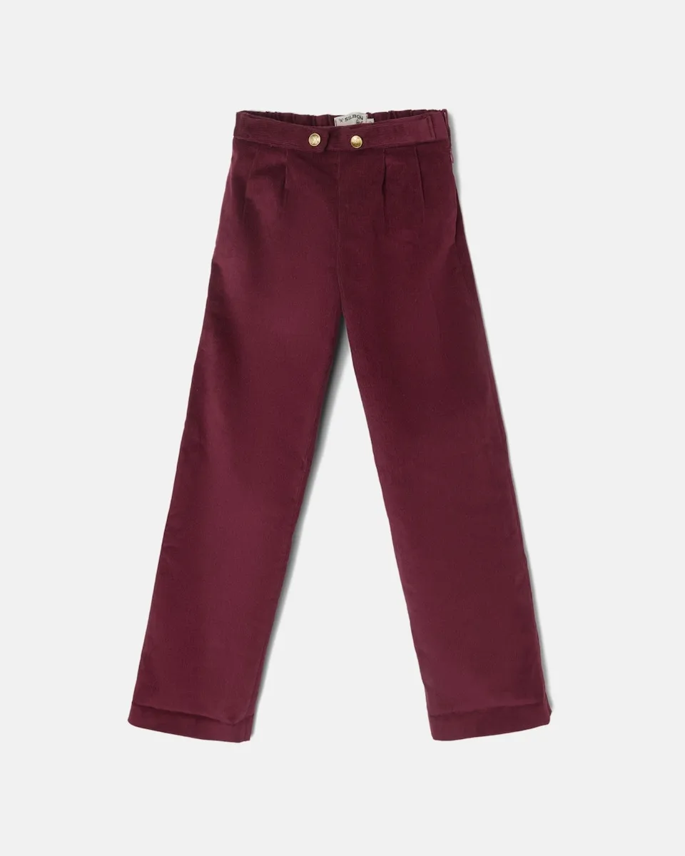 Прямые брюки из вельвета бордового цвета, выполненные из 100% хлопка. Имеют пояс с деталями из золота и индивидуальными пуговицами, а также складки спереди. Снабжены боковыми карманами в стиле "чино". Сделано в Испании.