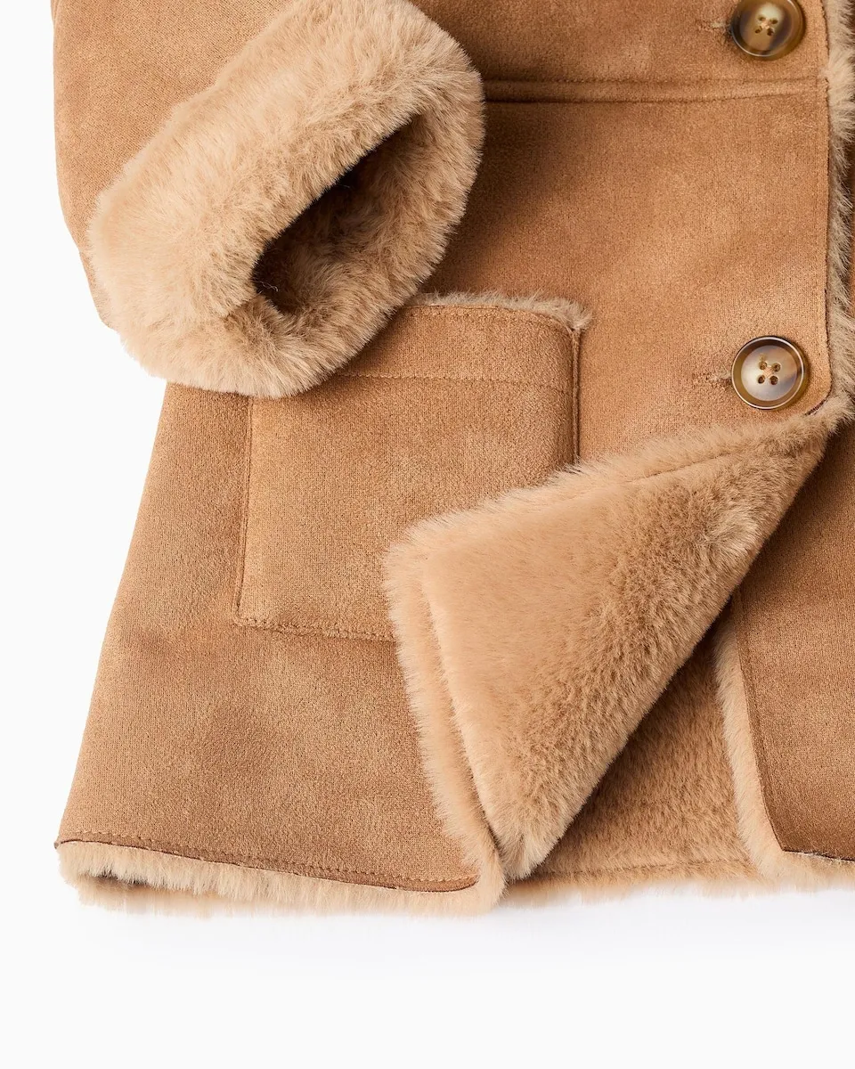Куртка из замши цвета верблюжьей шерсти средней длины для девочки. С капюшоном. Подкладка из искусственного меха, мягкая и уютная, продолжается до рукавов. Два кармана. Застежка на пуговицы. Внутренняя этикетка для имени девочки. Идеально подходит для осени и зимы на улице.