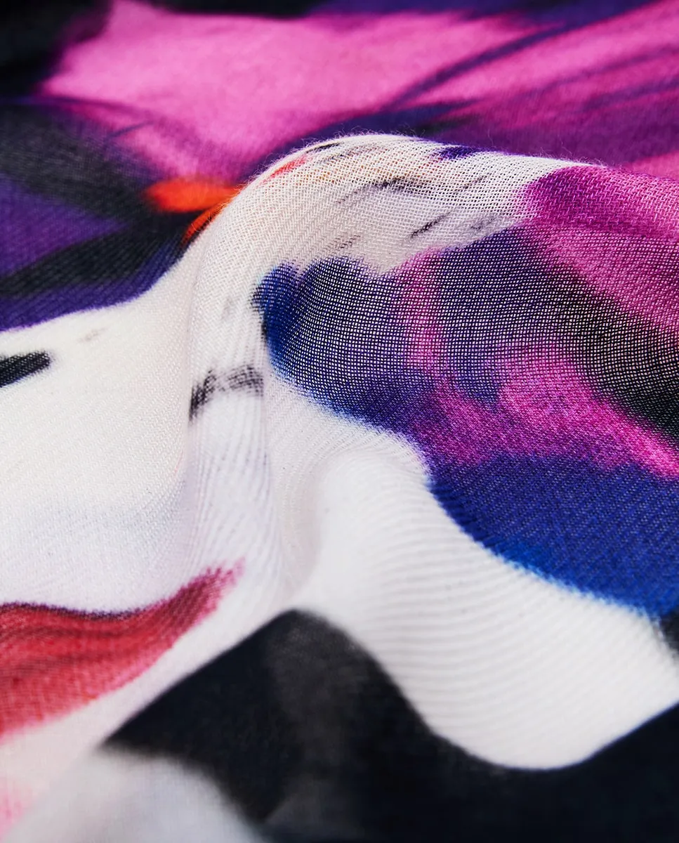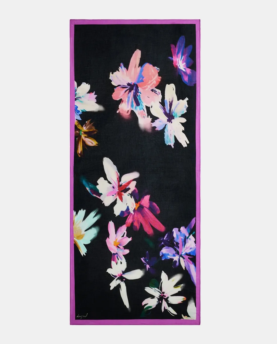 Большой прямоугольный платок, приятный на ощупь, с цветочным принтом ярких цветов на черном фоне.