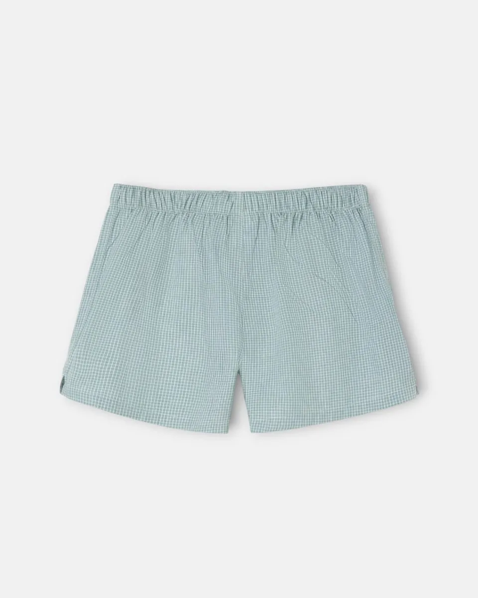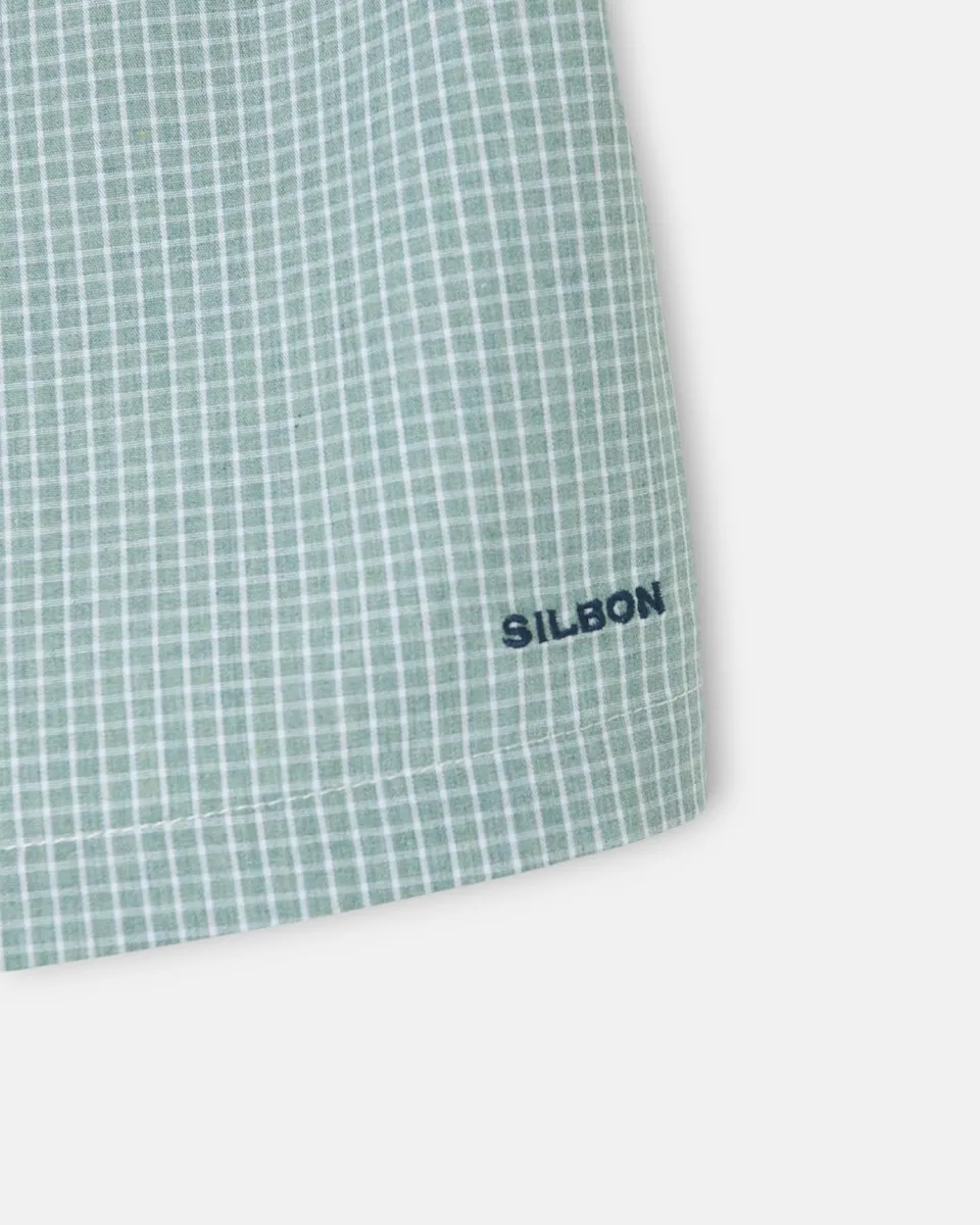 Трусы в зеленую клетку, изготовленные из хлопковой смеси. Имеют застежку на индивидуальные пуговицы и внутреннюю резинку. На нижней части вышиты буквы Silbon.