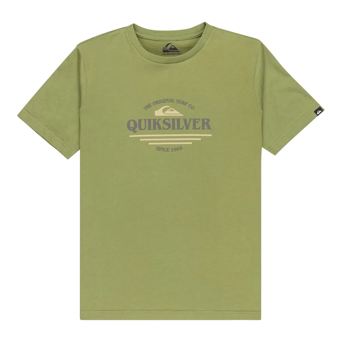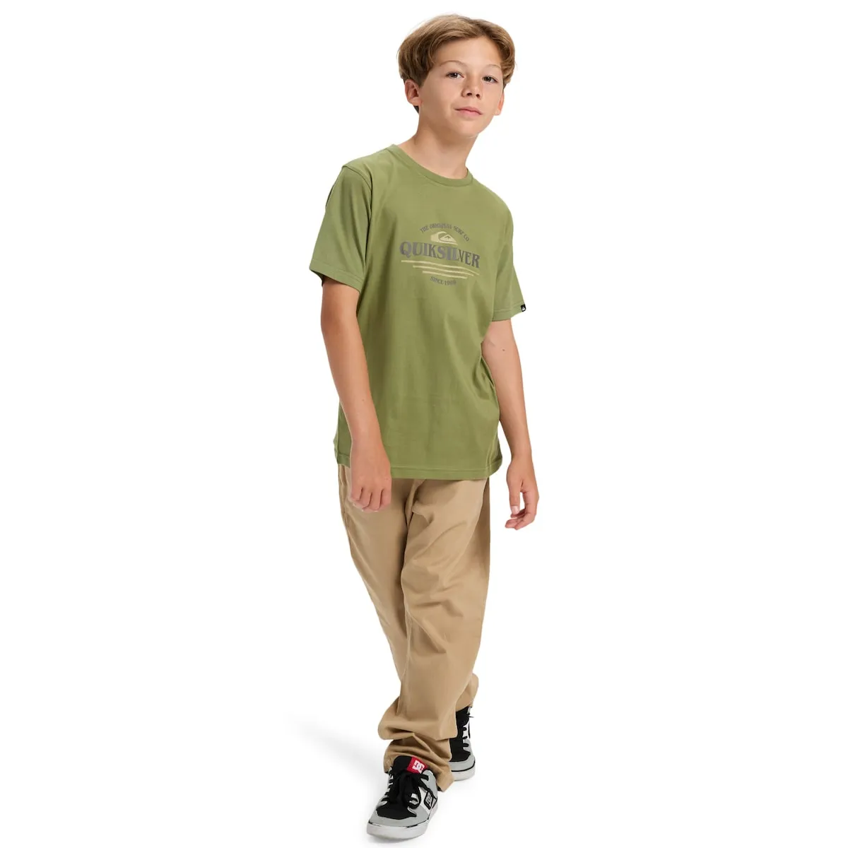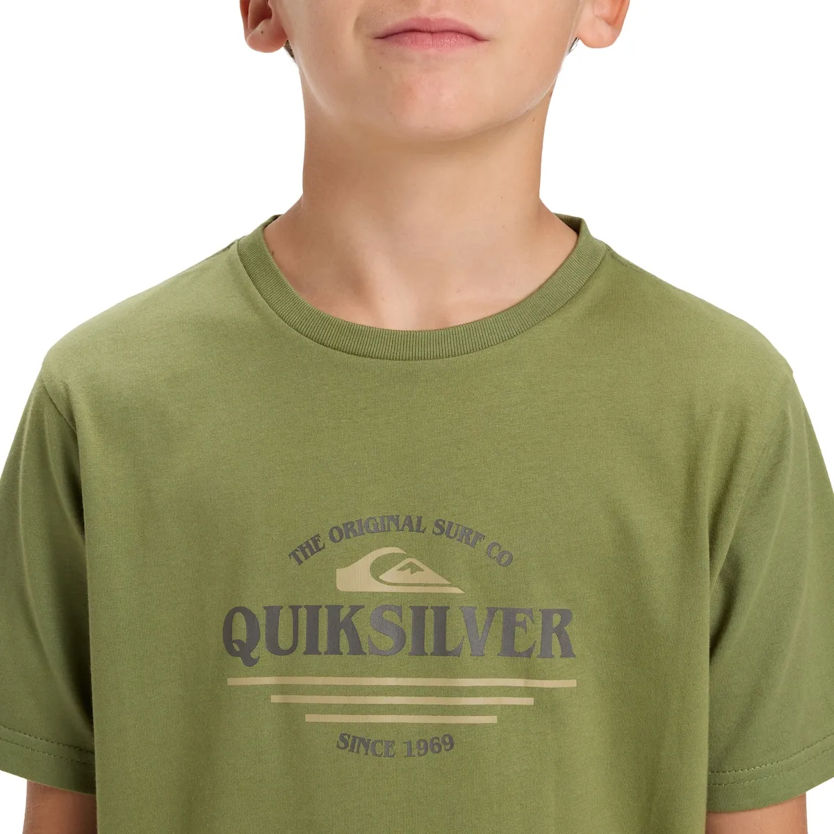 Футболка с коротким рукавом для детей 8-16 лет. Характеристики включают: Ткань: хлопковый трикотаж [160 г/м²], Крой: обычный, Воротник: круглый, Принт на груди и этикетка Quiksilver на подоле рукава.