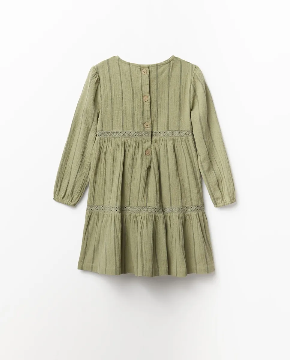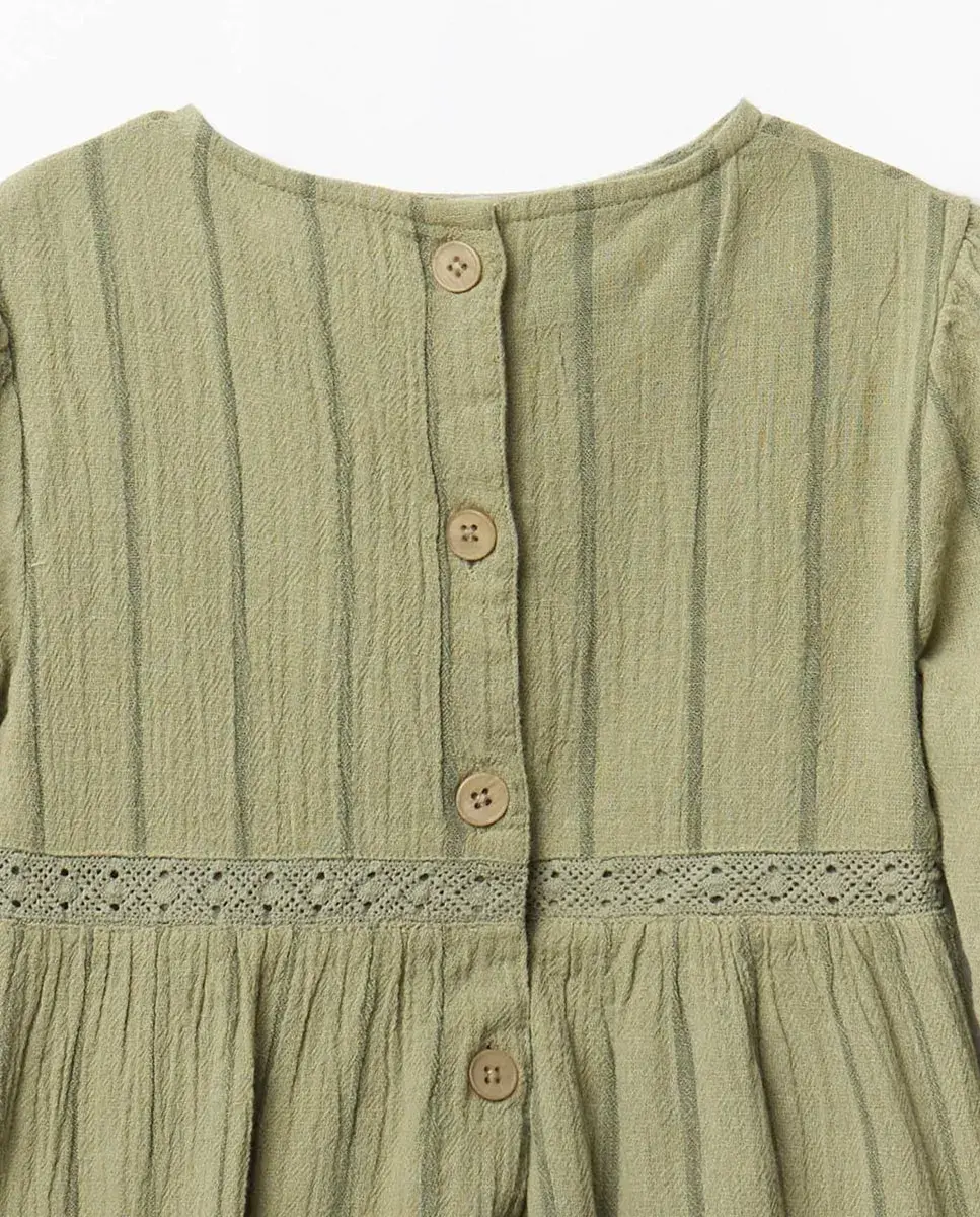 Платье-рубашка с длинными рукавами и круглым вырезом. Застежка на пуговицы на спине
