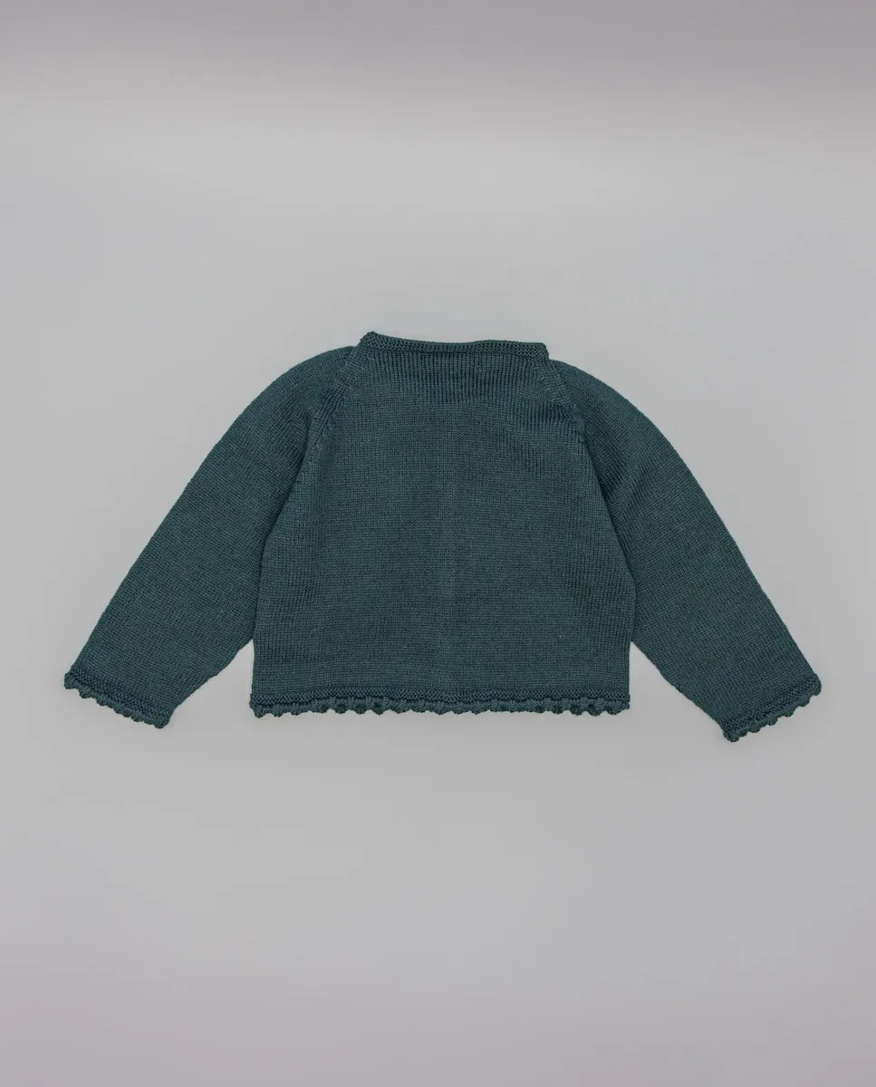 Зеленая трикотажная куртка с застежкой спереди на декоративную пуговицу. Бесшовный дизайн для большего комфорта. Доступна с размера 3 месяца до 14 лет.