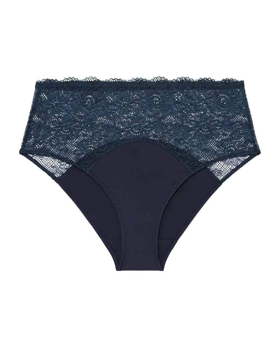 Трусы с высокой талией с кружевной передней и задней частями и большими закругленными сетчатыми вставками. Талию подчеркивает кружевная окантовка с волнистым краем спереди и сзади. Тонкая резинка вокруг бедер. Основа 100% хлопок. Экологичная линейка SIMONE CARES: кружево содержит не менее 68,9% переработанных волокон.