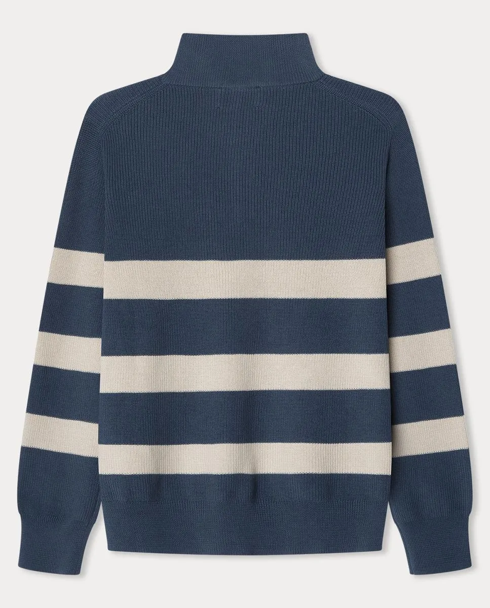 Водолазка с высоким воротником и короткой молнией, контрастные горизонтальные полосы, логотип на передней части и приталенный крой на манжетах и подоле.
