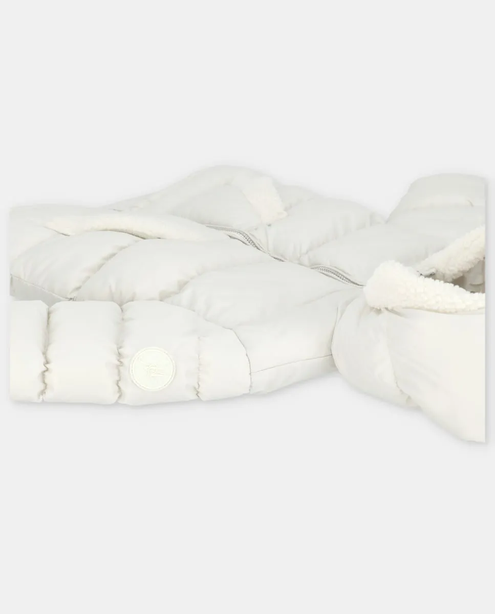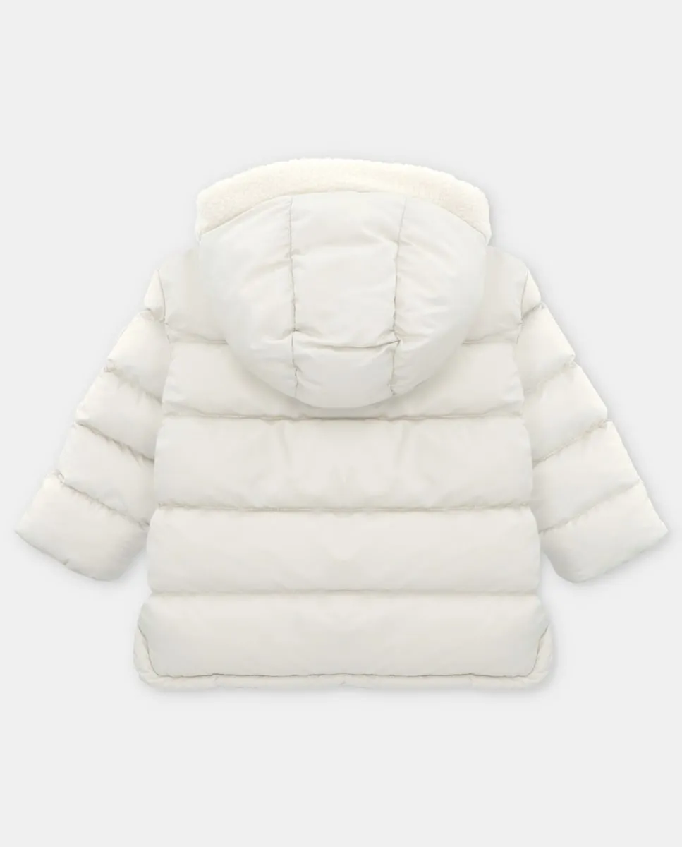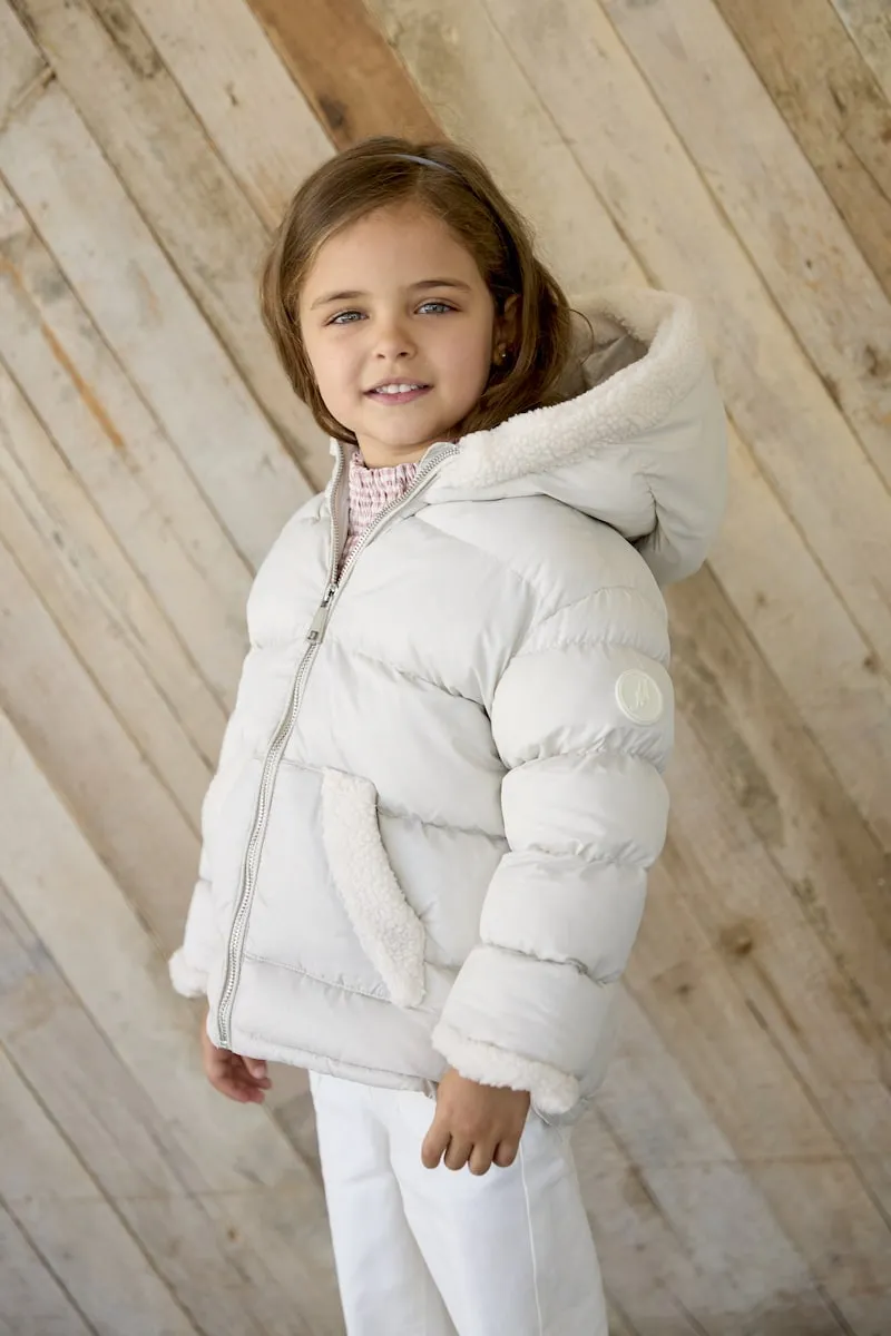 Детское пуховое пальто с капюшоном, с отделкой из овечьей шерсти, передние карманы по центру с овечьей отделкой и логотипом на бирке, цвет камня. Изготовлено из 100% полиэстера.