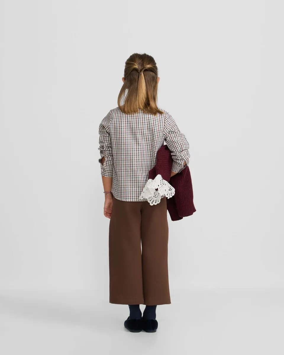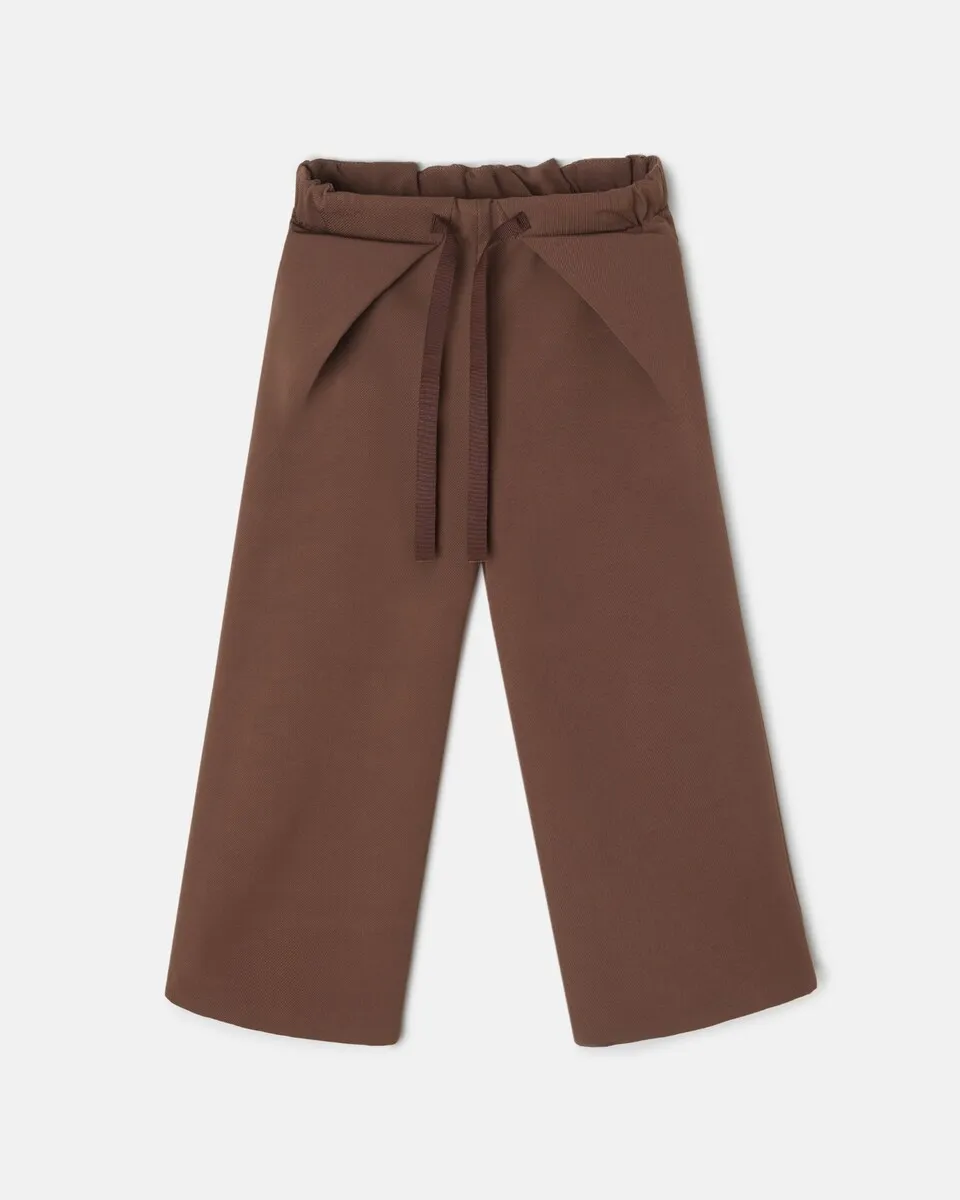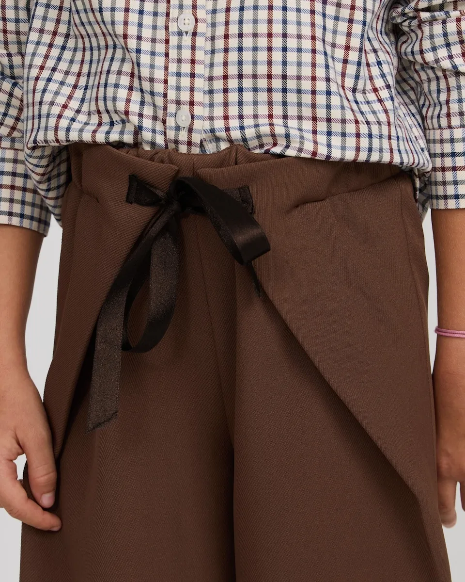 Прямые брюки для девочек шоколадного цвета. Имеют эластичный пояс с декоративным бантом спереди, имитирующим застежку. Спереди есть складки, обеспечивающие свободу движения и комфорт. Прямой крой. Доступны в двух цветах.