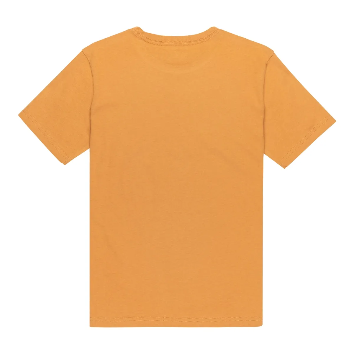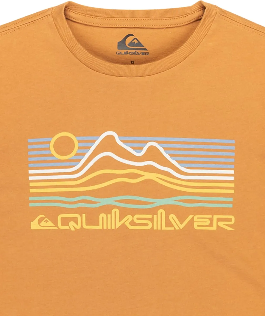 Футболка с коротким рукавом для детей 8-16 лет. Характеристики включают: Ткань: хлопковый трикотаж [160 г/м²], Крой: обычный, Воротник: круглый, Принт на груди и этикетка Quiksilver на подоле рукава.